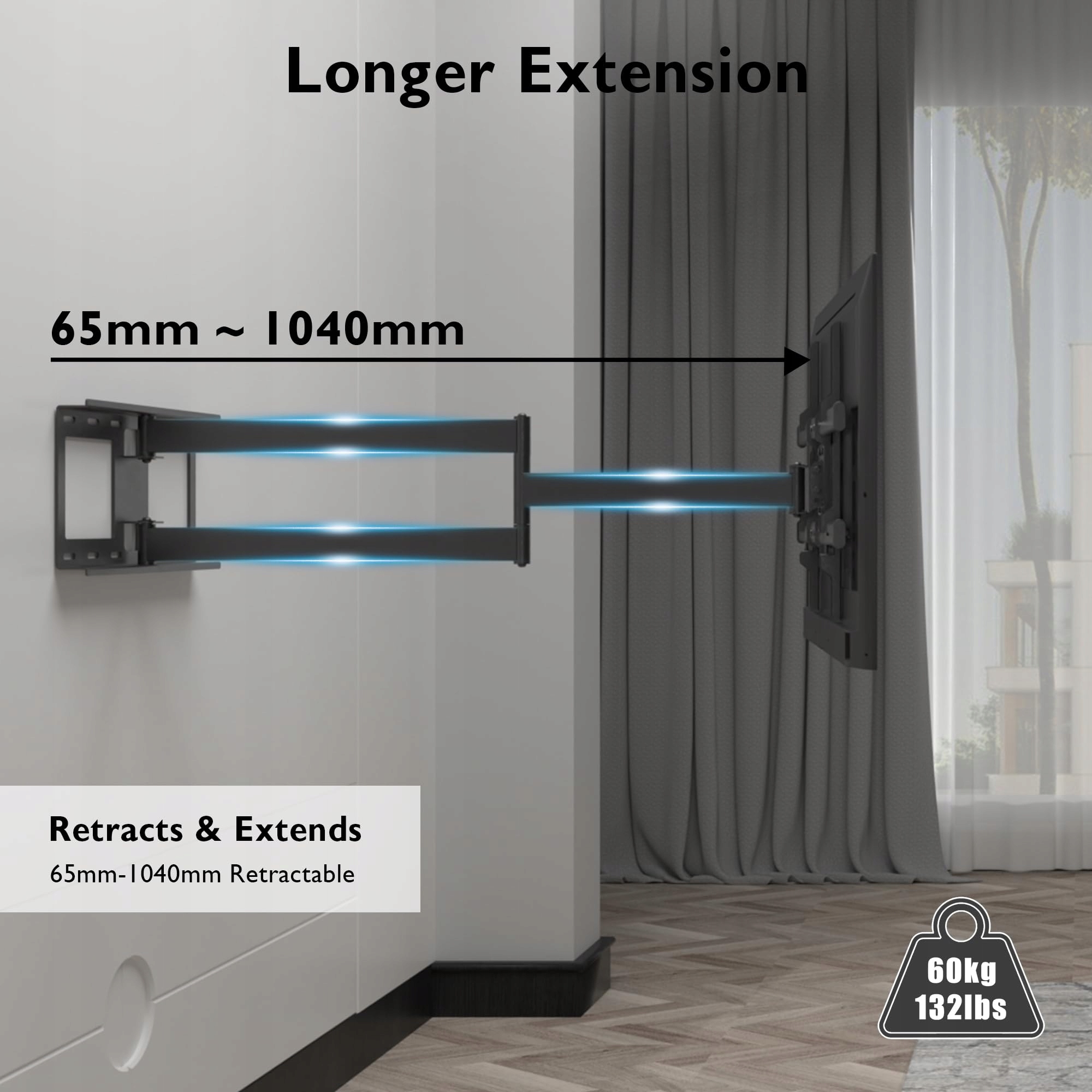 Oszczędność miejsca: Uchwyt ścienny można wysunąć na maksymalnie 1040 mm i wsunąć na odległość zaledwie 65 mm od ściany, co oszczędza cenne miejsce; W zestawie kabel HDMI o długości 1,8 m i 5 opasek kablowych, które nadają Twojemu domowi schludny wygląd.