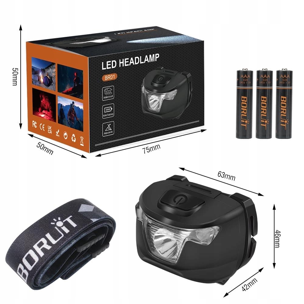 Boruit BR01 latarka czołowa do użytku na zewnątrz i na kemping. Główne światło LED białe, do 240 lumenów oraz boczne światło LED, 3 baterie AAA, z elastyczną opaską na głowę