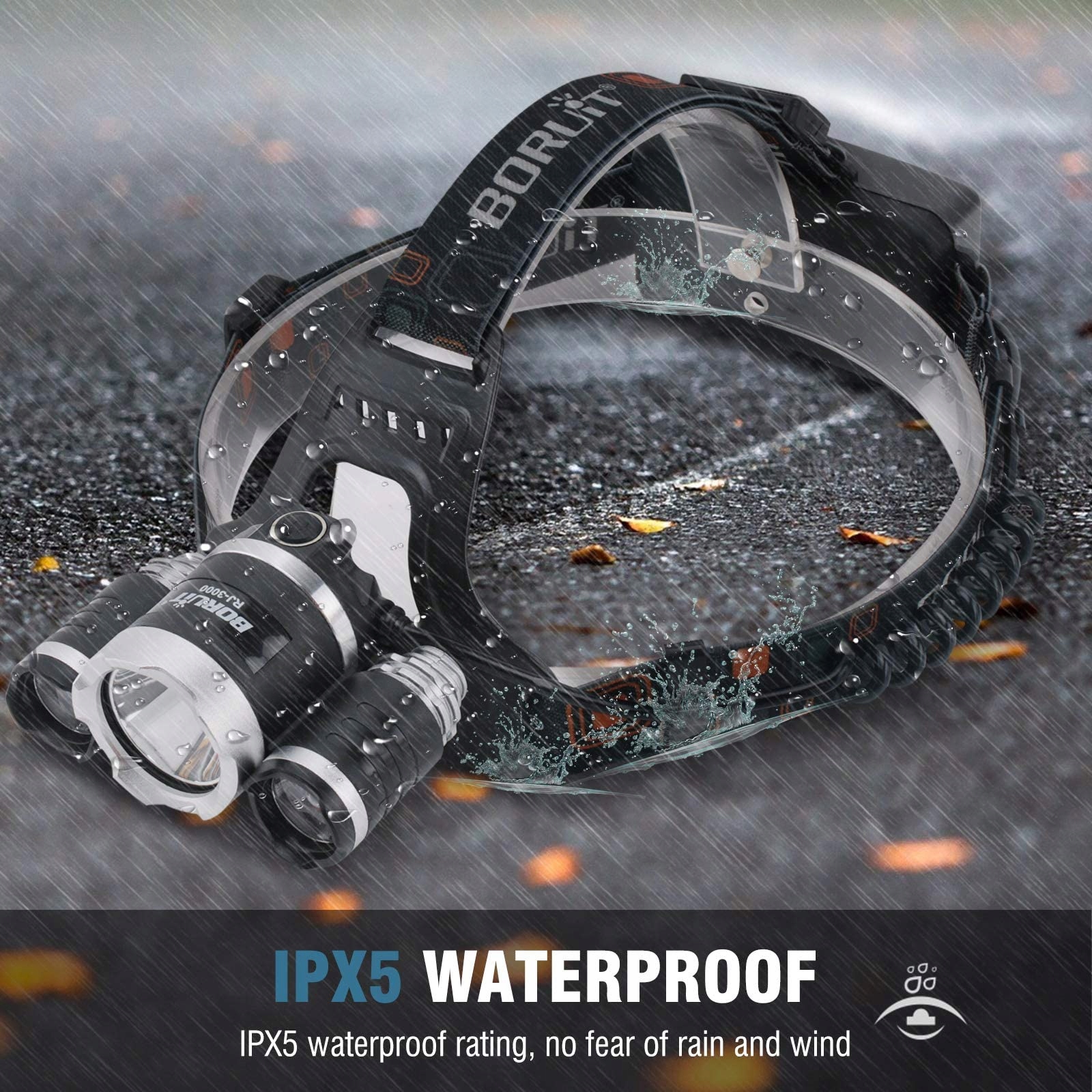 BORUIT RJ3000 Latarka czołowa LED wielokrotnego ładowania, 5000 lumenów i 4 tryby superjasnej latarki czołowej, wodoodporna IPX5, latarka na kask z 2 akumulatorami, idealna dla dorosłych i dzieci, do biegania, joggingu, wędkowania, biwakowania