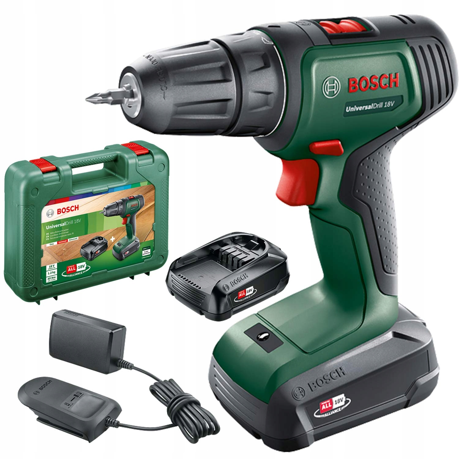 Zakres dostawy: UniversalDrill 18V, 2x 1,5 Ah akumulator, ładowarka AL 1810 CV, bit do wkrętów, walizka