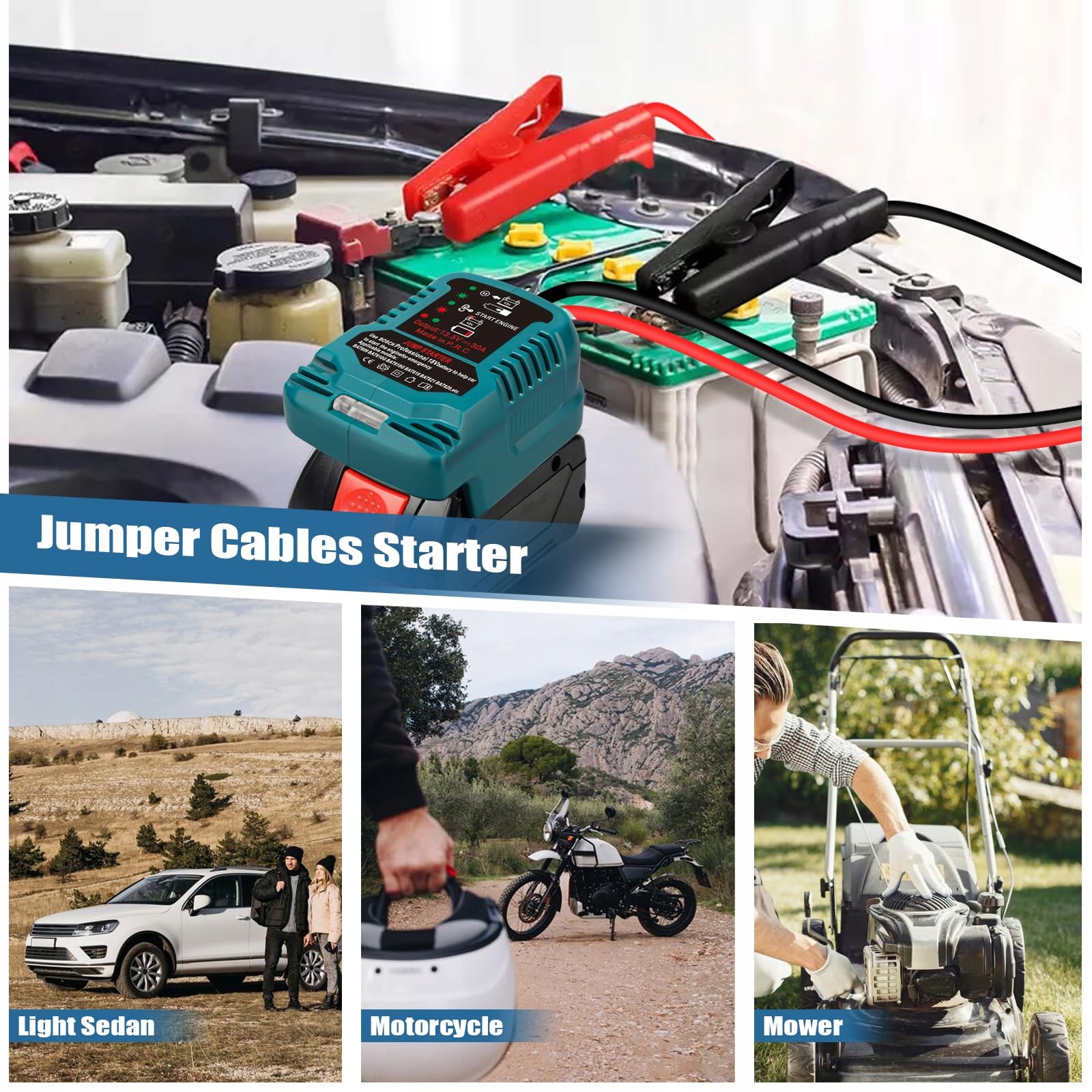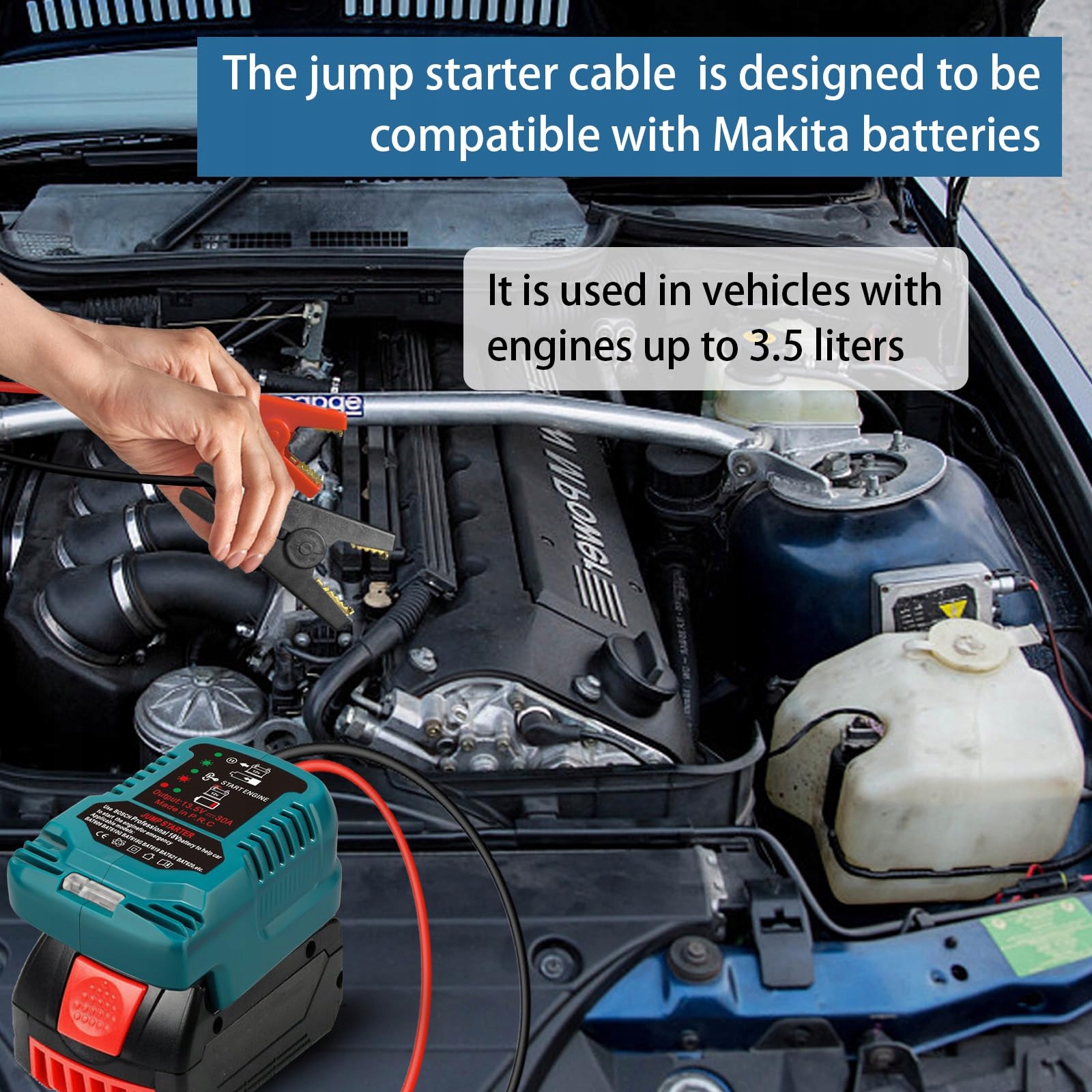 Łatwa obsługa:Aby użyć rozrusznika, najpierw mocno podłącz adapter kabla rozruchowego do swojej baterii Bosch 18V, następnie przymocuj czerwoną klemę do dodatniego bieguna (+) pojazdu, a czarną klemę do ujemnego bieguna (-). Następnie uruchom samochód i usuń klemy.