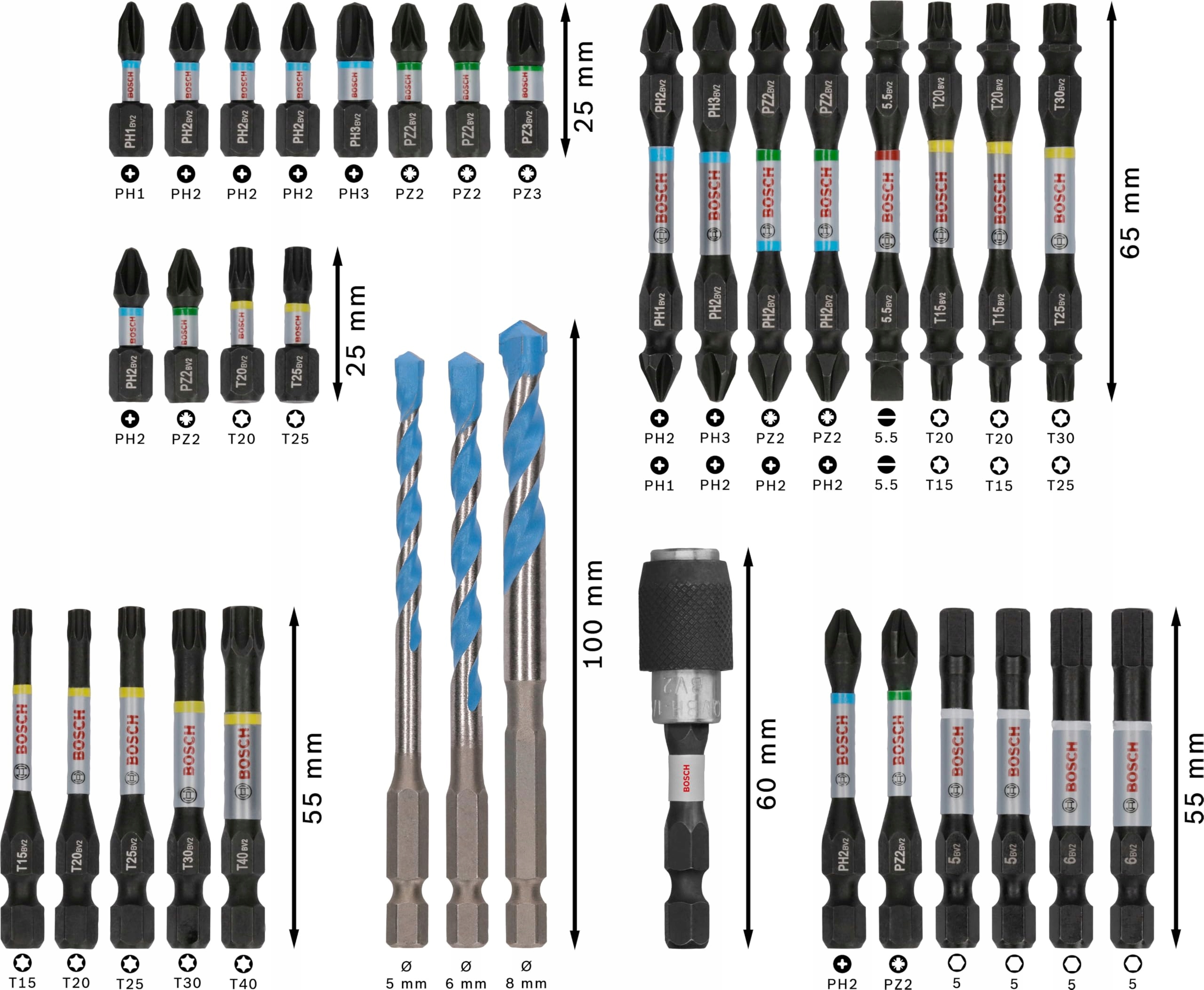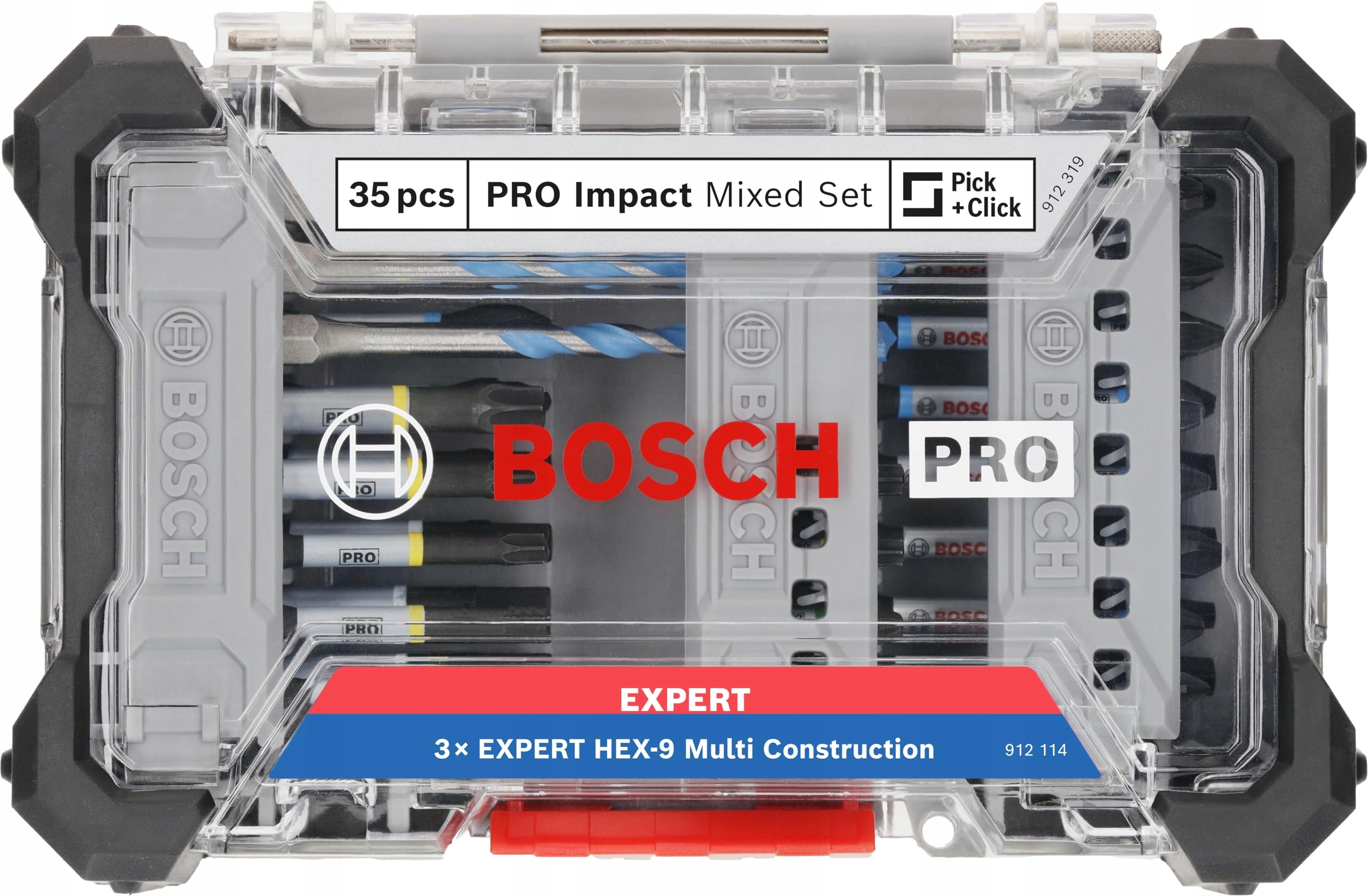 Zakres dostawy: końcówki wkrętakowe Bosch PRO Impact i zestaw wierteł Multi Construction Mixed Set, wyłączność, 35-częściowy.
