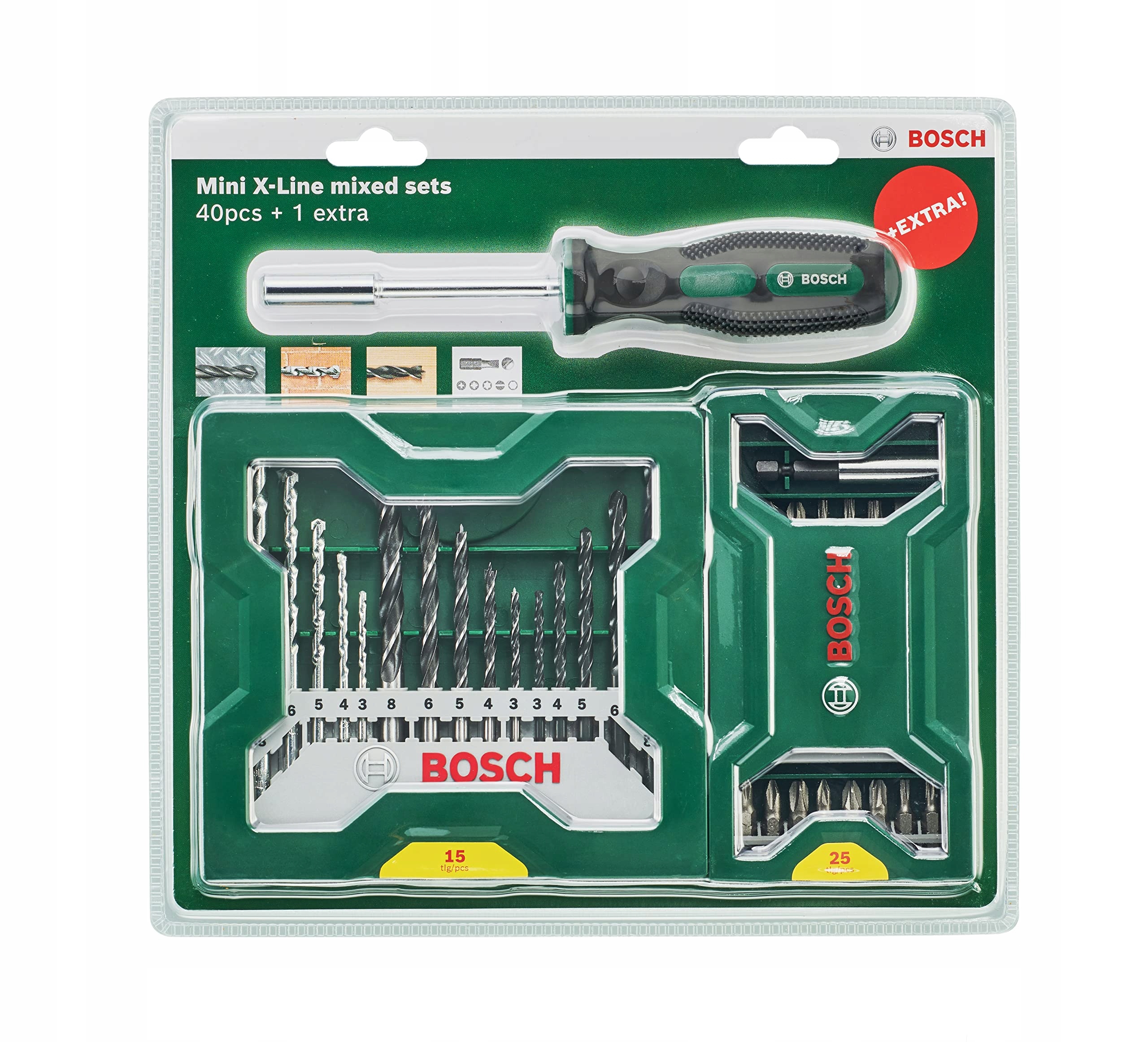 Dwa mini-zestawy Mixed Mini-X-Line z bitami wkrętakowymi i wiertłami spiralnymi, połączone z przydatnym darmowym wkrętakiem Bosch. Do wszystkich prac wiertarskich i wkręcających