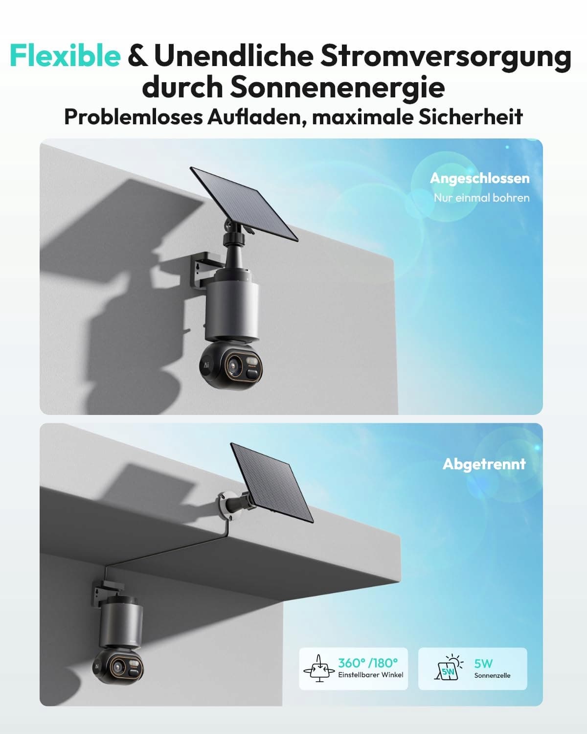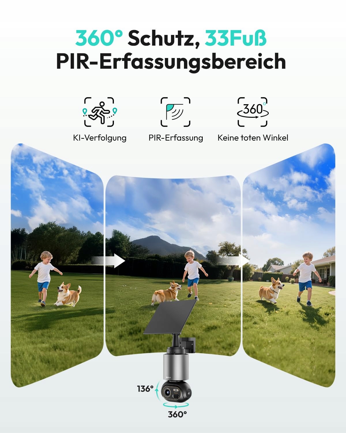 【360° monitoring z wykrywaniem AI】: Obiektyw bezprzewodowej kamery na baterię z funkcją obrotu i pochylenia wspiera płynny widok panoramiczny 360° bez martwych punktów, precyzyjnie wykrywa pojazdy, pieszych i zwierzęta domowe oraz automatycznie śledzi ich ruchy. Żadna podejrzana aktywność nie umknie jej czujnym 'oczom'. Dzięki funkcji dwukierunkowej kamery bezpieczeństwa WLAN na zewnątrz możesz komunikować się z odwiedzającymi w czasie rzeczywistym.