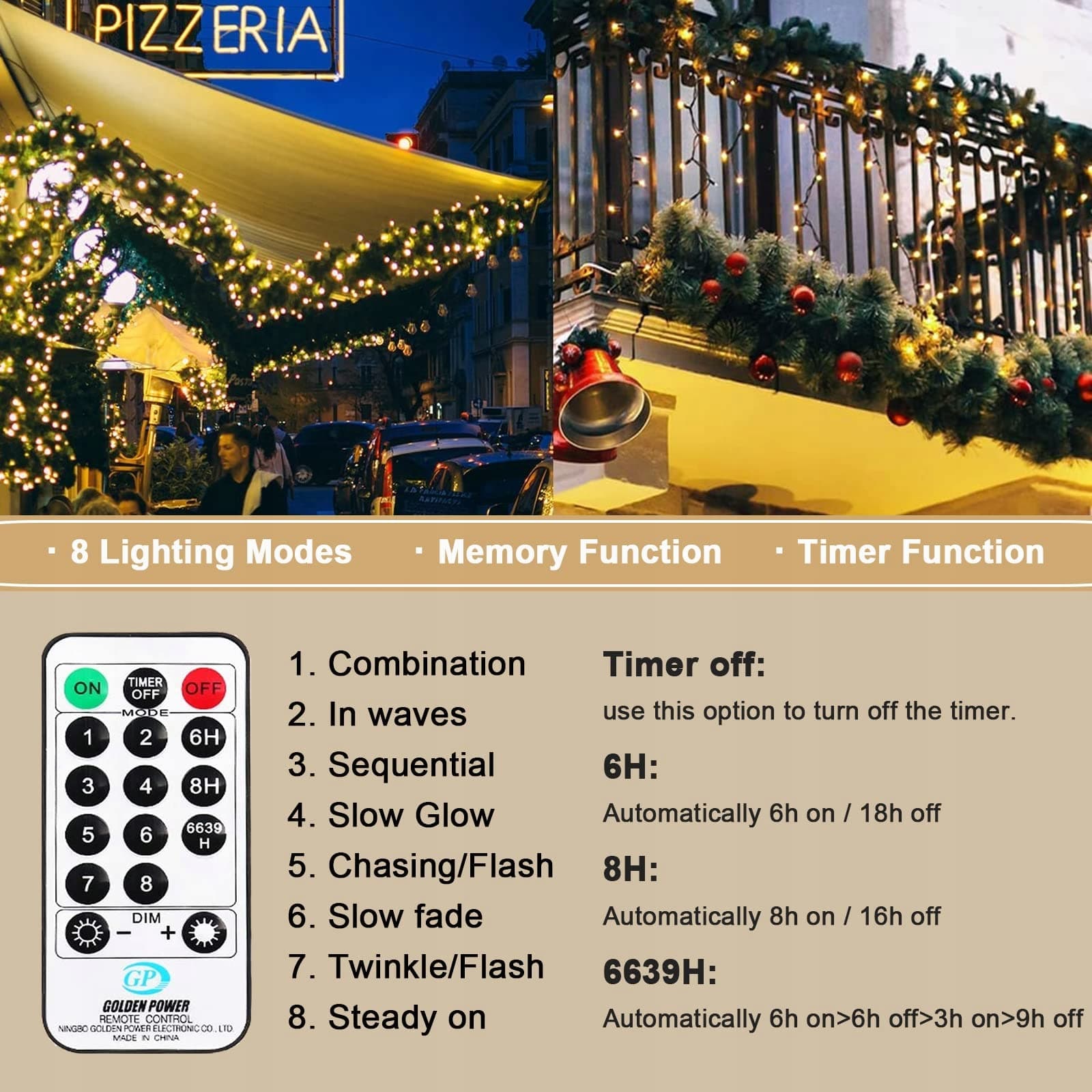 [8 trybów i funkcja timera]: kombinacja, fala, sekwencyjnie, wolne świecenie, bieganie/miganie, wolne przygasanie, miganie/miganie i zawsze włączone, różne tryby są sterowane za pomocą pilota oraz przycisków na wtyczce, łańcuch świetlny na zewnątrz ma również funkcję timera, ściemniania i pamięci.