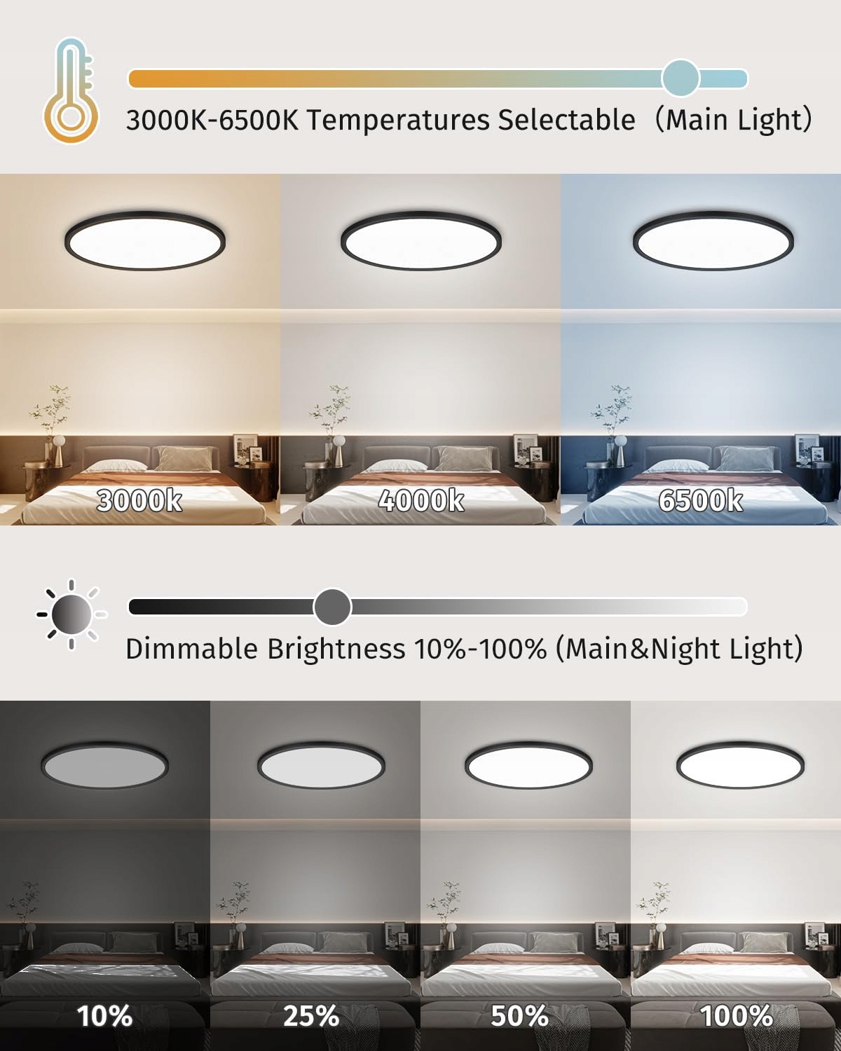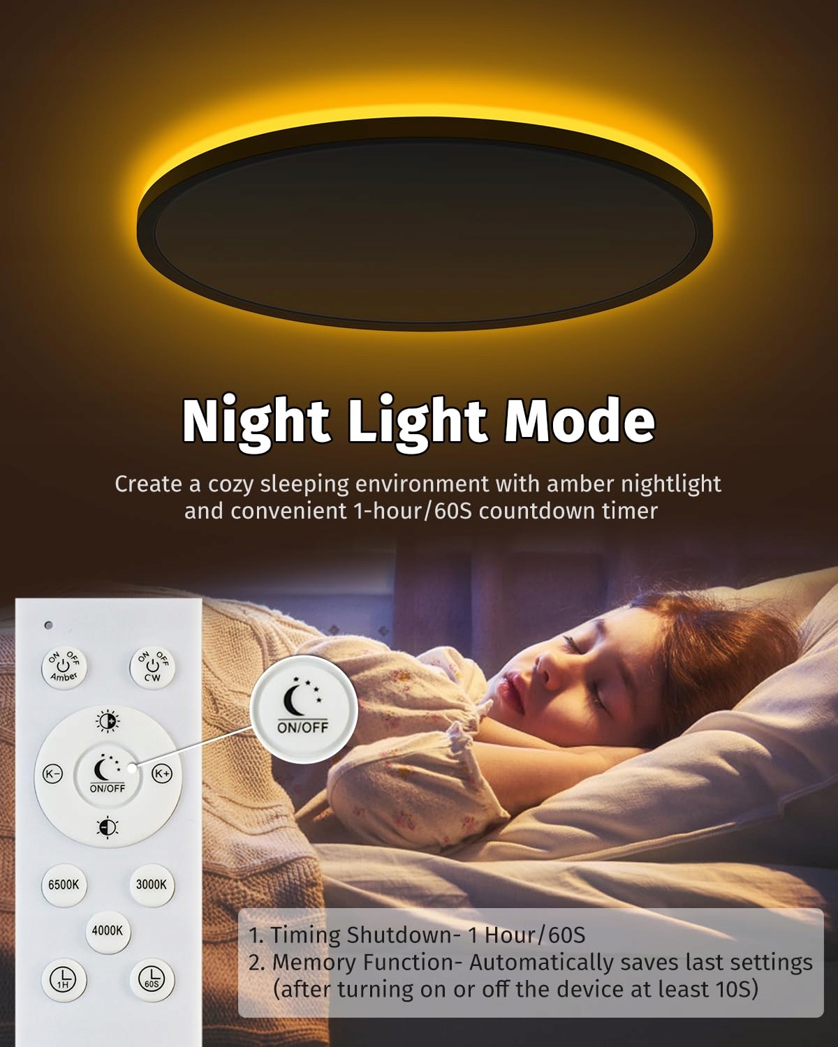 【1800K nocna lampka】Lampa sufitowa LED z podświetleniem zaprojektowana jako nocna lampka, 6W 1800K bursztynowa nocna lampka emituje pomarańczowe światło z tyłu lampy, jak zaćmienie słońca, tworząc ciepłą, miękką nocną atmosferę. Główne światło i nocna lampka mogą być włączane osobno lub jednocześnie. Za pomocą pilota można regulować jasność lampy LED i nocnej lampki w zakresie od 10% do 100%. Możesz wybrać światło, które najlepiej odpowiada Twoim potrzebom.