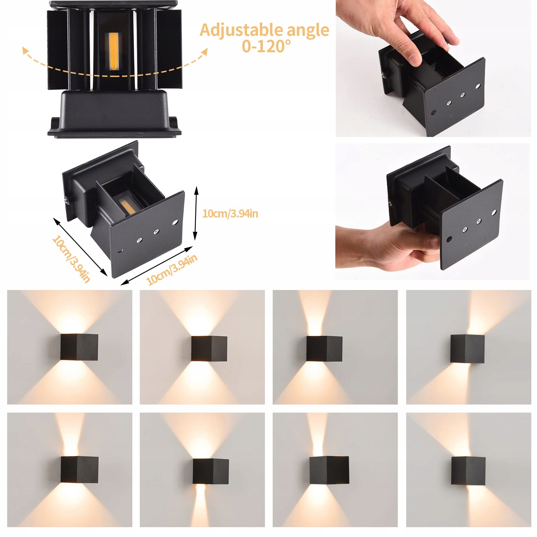 【Regulowany kąt świecenia】Nasze lampy LED na zewnątrz wyposażone są w funkcję regulacji kąta świecenia. Dzięki ukrytym skrzydełkom kąt świecenia lamp ściennych na zewnątrz można indywidualnie regulować w górę i w dół. Kąt świecenia można ustawić od 0 do 120°, co pozwala na tworzenie różnych efektów świetlnych. Lampy ścienne zapewniają piękne efekty świetlne do oświetlenia i dekoracji.