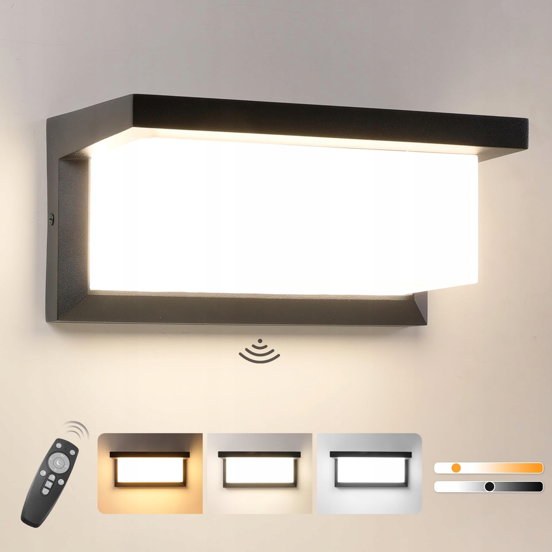 BOYIR 18W Zewnętrzna lampa ścienna z czujnikiem ruchu, ściemnialna lampa ścienna LED na zewnątrz z pilotem, 3000K-6500K, wodoodporna IP65, aluminiowa lampa ścienna na zewnątrz do ogrodu, tarasu, czarna
