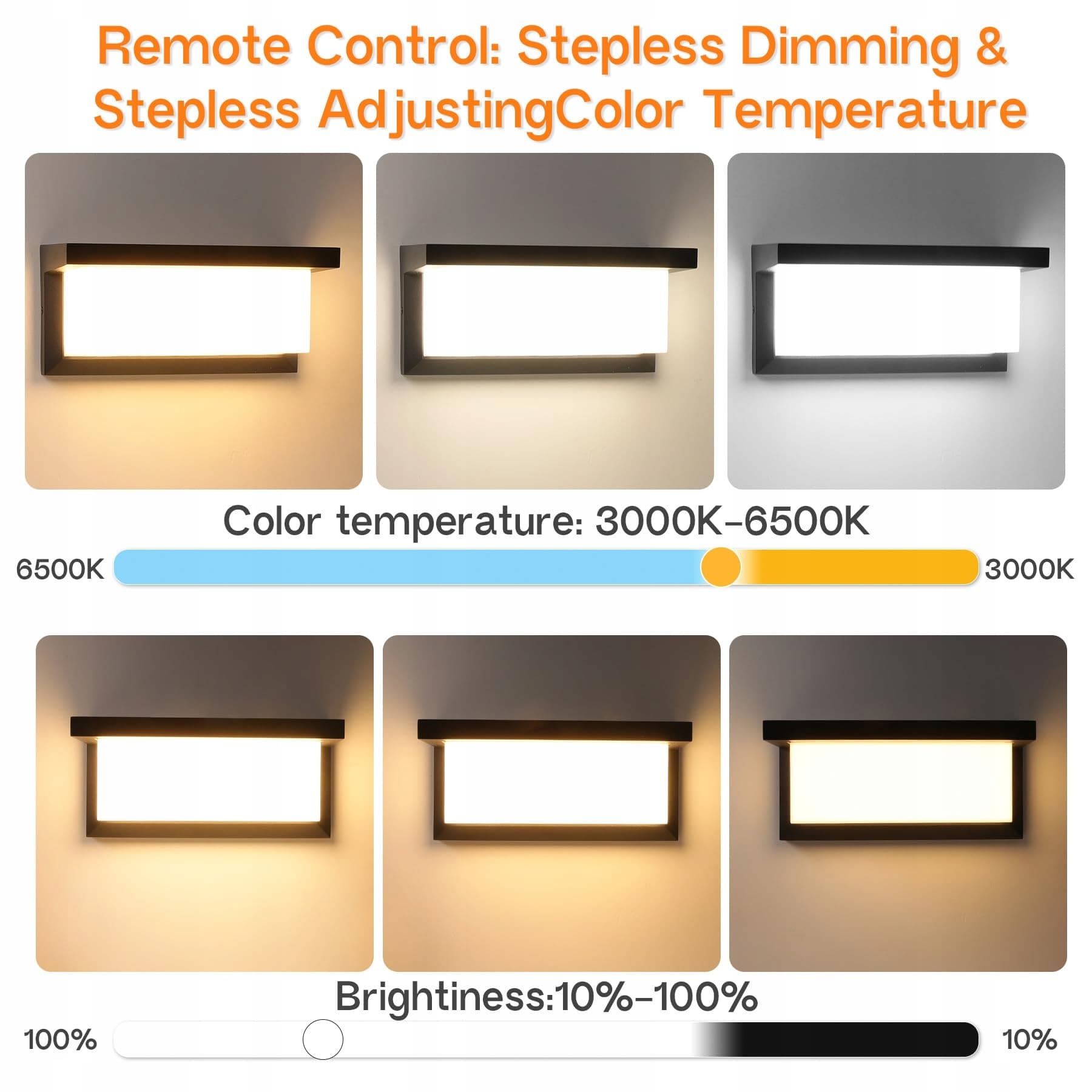 【Płynna regulacja jasności i regulowana temperatura barwowa】Za pomocą pilota możesz sterować jasnością, temperaturą barwową, timerem oraz funkcją pamięci lampy ściennej na zewnątrz. Naciśnij przycisk funkcyjny na pilocie, aby wybrać jasność od 10% do 100% oraz temperaturę barwową od 3000K do 6500K. Twórz idealną atmosferę w każdej chwili zgodnie z Twoimi potrzebami, spełniając różnorodne wymagania i dopasowując ją do różnych okazji.