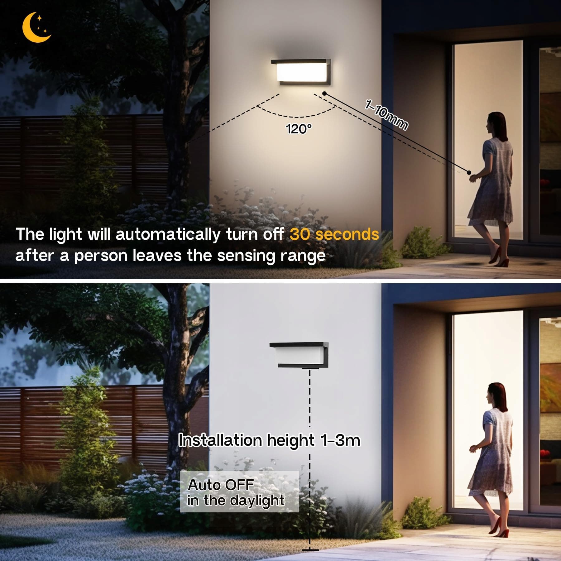 【Ulepszony czujnik ruchu】Nasza lampa zewnętrzna wykorzystuje najnowocześniejszy radar mikrofalowy oraz czujniki światła i działa tylko w nocy. Gdy ktoś przechodzi obok, lampa ścienna automatycznie się włącza. Wyłącza się automatycznie, gdy przez 20 do 30 sekund nie wykryje ruchu. Lampa zewnętrzna ma kąt wykrywania 120°, zasięg wykrywania 1-8 m oraz zalecaną wysokość montażu 1-3 m.