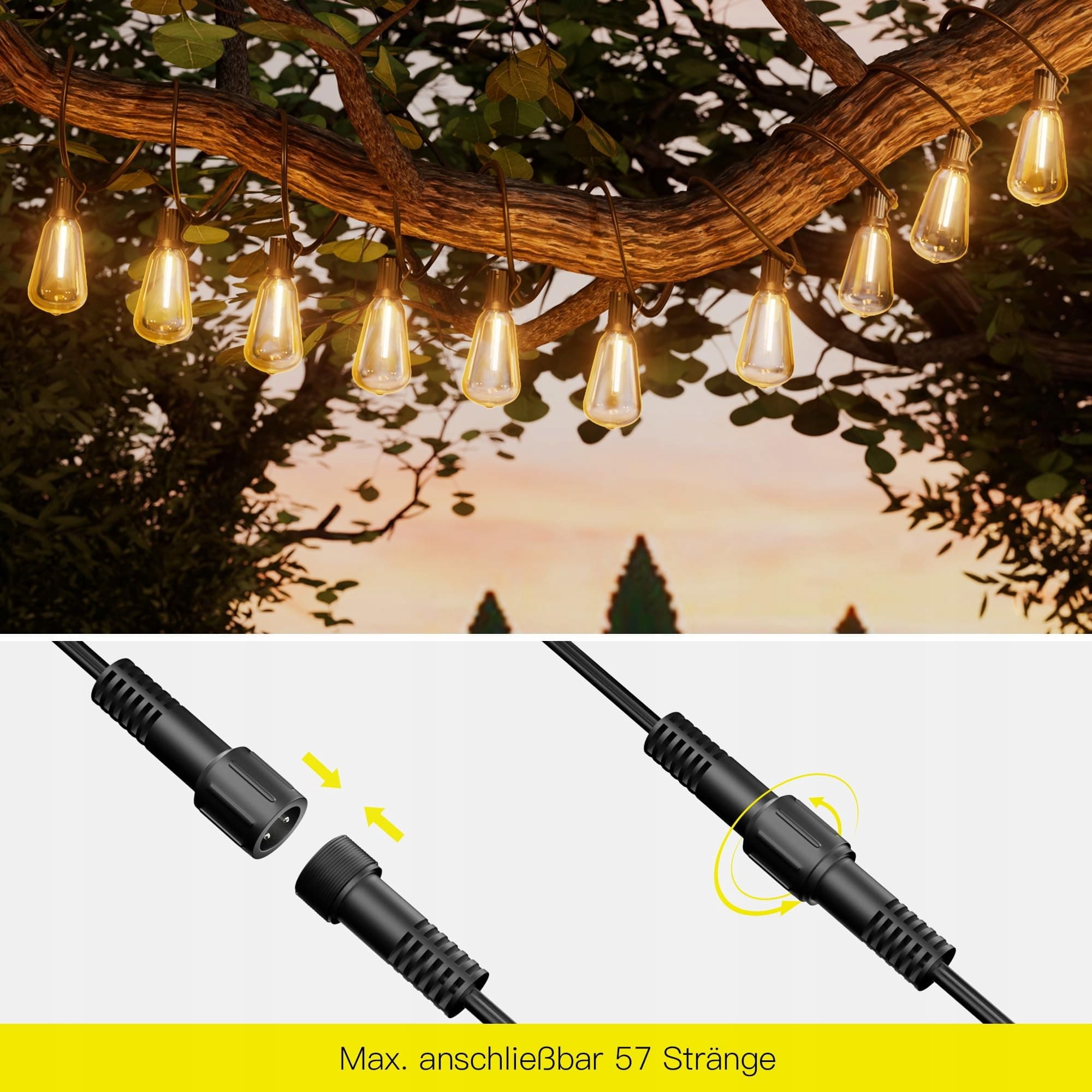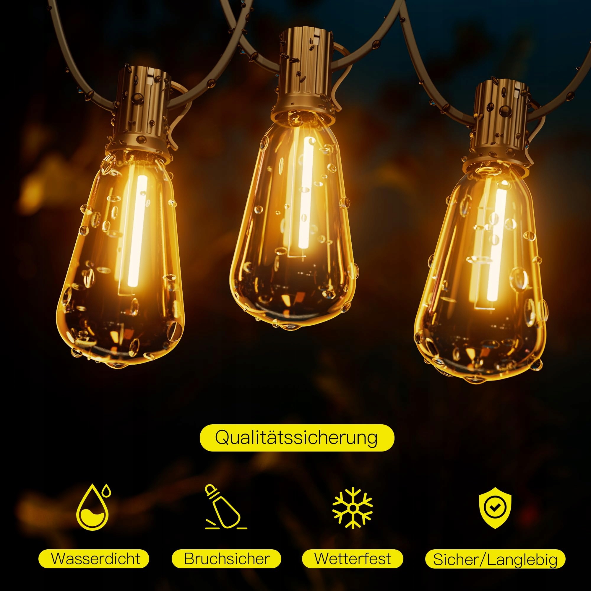 Nasze wysokiej jakości, wodoodporne oświetlenie ogrodowe wykonane jest z czystego drutu miedzianego o grubości 0,6 mm oraz materiału ognioodpornego, aby chronić łańcuch świetlny przed przepaleniem – bezpieczne w użyciu. Wyposażone w 15 wiszących żarówek LED ST38 E12, generują ponad 750 lumenów przy zużyciu tylko 7,5 W, co odpowiada żarówce 60 W. Dzięki temu oszczędzasz ponad 90% kosztów energii, jednocześnie ciesząc się energooszczędnym oświetleniem