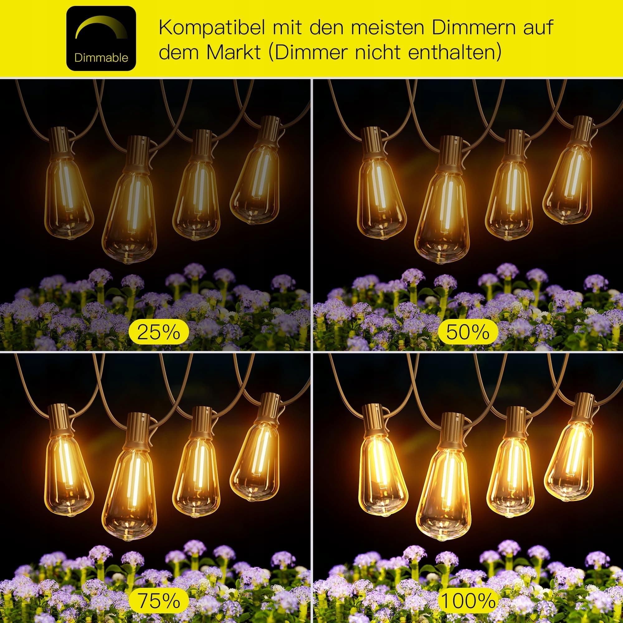 Te łańcuchy świetlne na taras są kompatybilne z większością ściemniaczy do łańcuchów świetlnych (ściemniacz nie jest w zestawie), co oznacza, że możesz ustawić pożądaną jasność na różne okazje. Te ogrodowe lampki z wtyczką można połączyć do 57 segmentów tych 9-metrowych łańcuchów świetlnych (jeden za drugim), aby oświetlić bardzo duży ogród na imprezę lub wesele