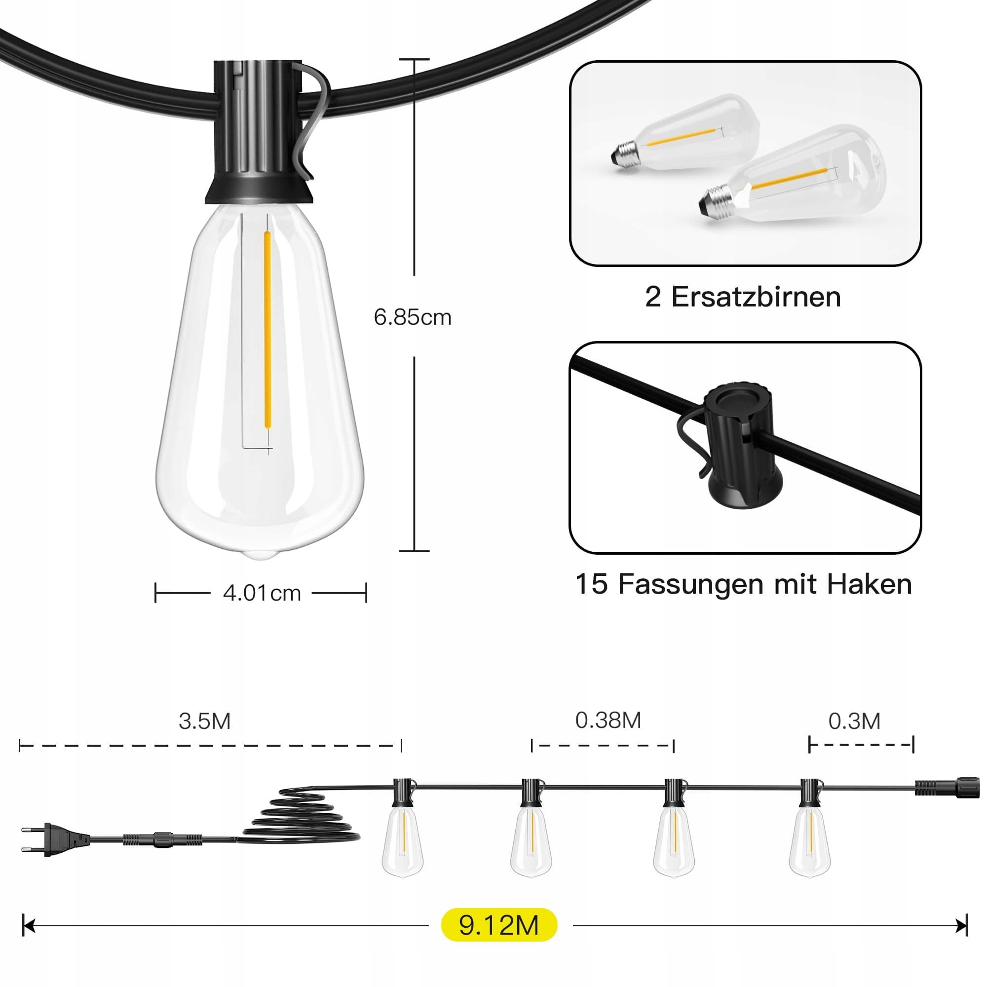 Łańcuch świetlny LED na zewnątrz z zasilaniem - 9M 15+2 żarówki ST38 oświetlenie ogrodu balkon łańcuchy świetlne na zewnątrz IP54 wodoodporne pawilon lampki na taras imprezę