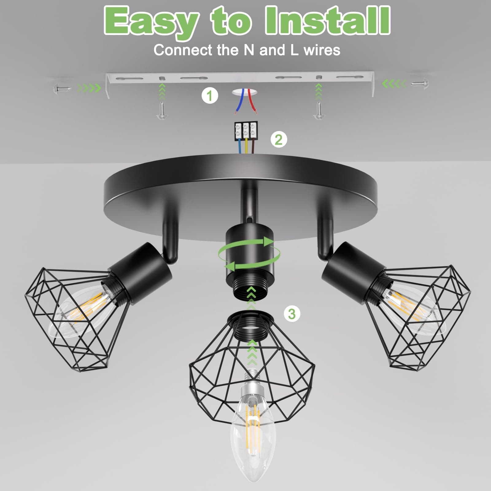 [Łatwy montaż] Montaż lampy sufitowej jest bardzo prosty. Przed montażem proszę wyłączyć prąd. Uwaga: nie ma oddzielnego przełącznika. ① Połącz przewód L i przewód N ② Zainstaluj podstawę na suficie ③ Osobno wkręć trzy klosze w podstawę ④ Podłącz żarówkę E14 do gwintu E14 ⑤ Ustaw głowicę lampy pod preferowanym kątem. Instrukcja zawiera szczegółowe instrukcje montażu