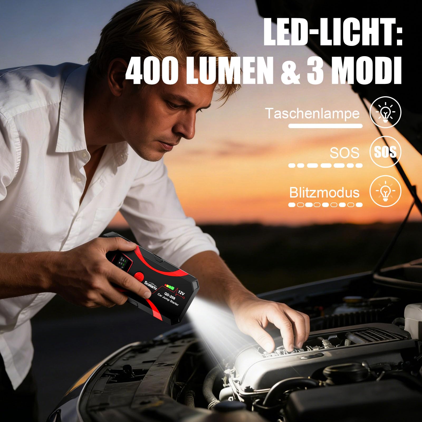 【Przenośna ładowarka i latarka LED】Powerbank rozruchowy z wbudowaną latarką LED – wbudowane światło 3-stopniowe wspiera Cię w ciemności lub sytuacjach awaryjnych. Powerbank rozruchowy z 2 wyjściami USB ładuje telefony, tablety i inne urządzenia USB w podróży.