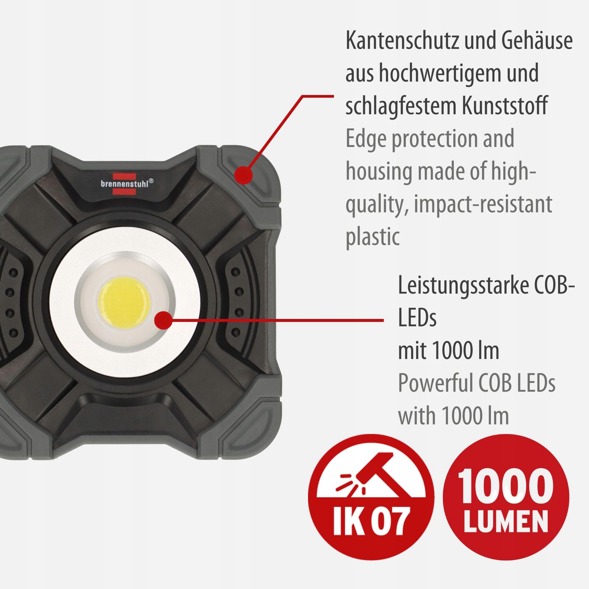 Mała, kompaktowa lampa LED z ochroną krawędzi i obudową z wysokiej jakości, solidnego i odpornego na uderzenia tworzywa sztucznego - idealna na budowę, w warsztacie, w domu, w ogrodzie, na kempingu, w różnych aktywnościach na świeżym powietrzu