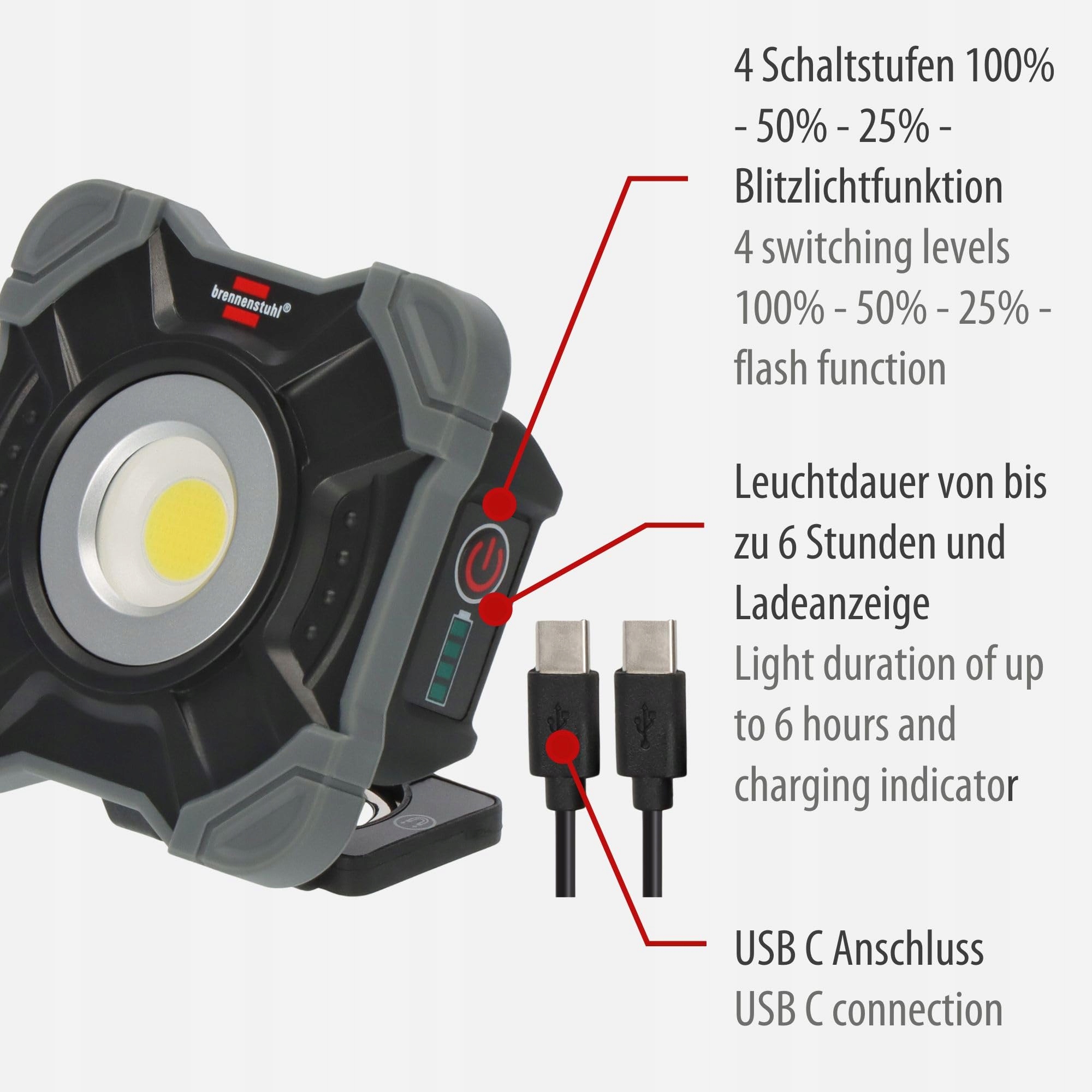 Superjasna lampa robocza LED z 4 poziomami jasności 100% - 50% - 25% - funkcją światła błyskowego i czasem świecenia do 6h oraz wskaźnikiem ładowania - reflektor LED w praktycznym formacie kieszonkowym z 1000lm, 6500K