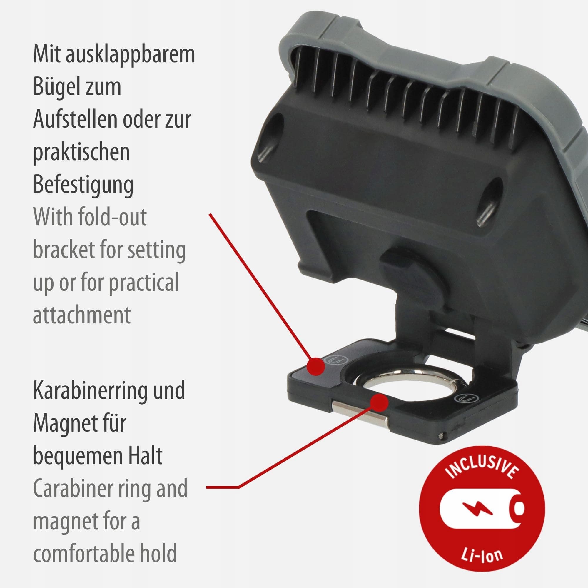 Ekstremalnie kompaktowy reflektor LED IP54 (odporny na kurz i zachlapania) z karabińczykiem i magnesem z tyłu dla wygodnego i ergonomicznego trzymania oraz elastycznego mocowania