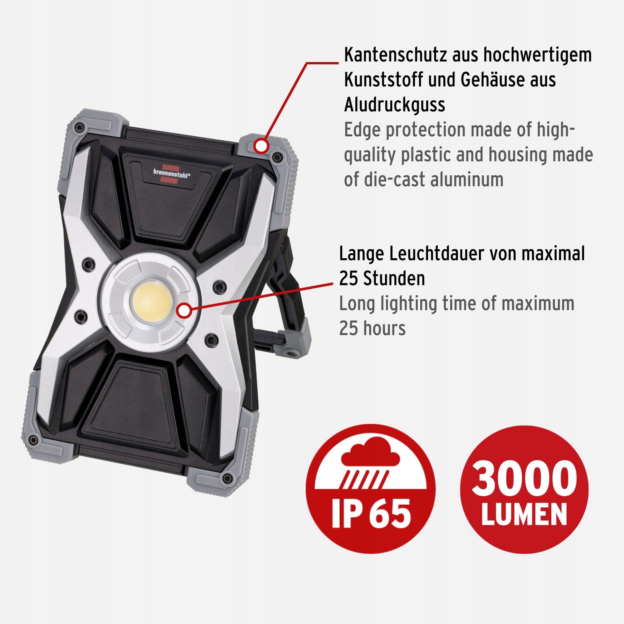 Akumulatorowa lampa robocza LED Brennenstuhl RUFUS/LED do warsztatu (LED reflektor budowlany z funkcją powerbanku, w tym kabel ładujący, obudowa z odlewu aluminiowego, 3000lm, IP65)