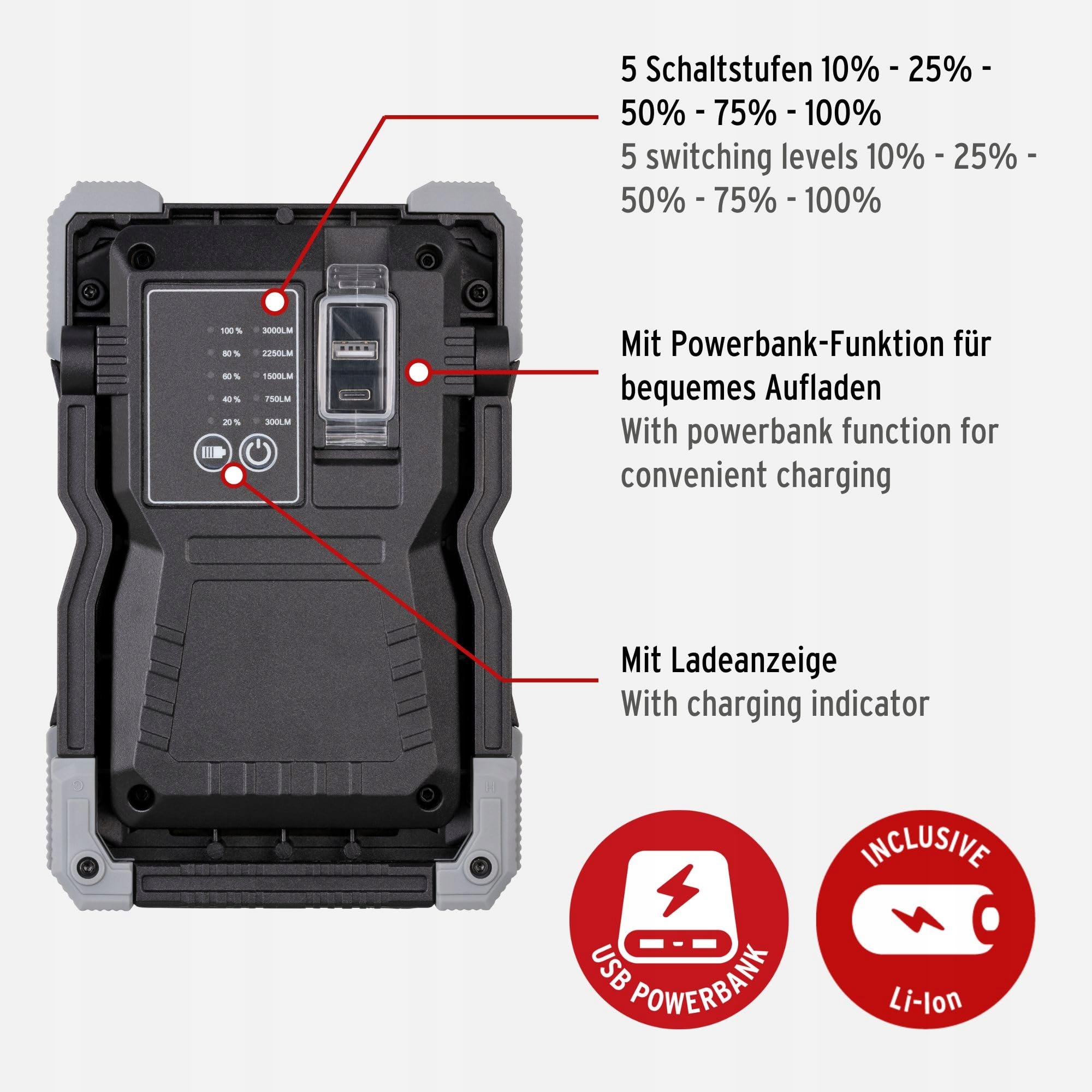 Lampa warsztatowa z wskaźnikiem ładowania, funkcją powerbanku do wygodnego ładowania np. smartfonów (gniazdo ładowania typu C) oraz stabilnym, wielostopniowym, składanym stelażem