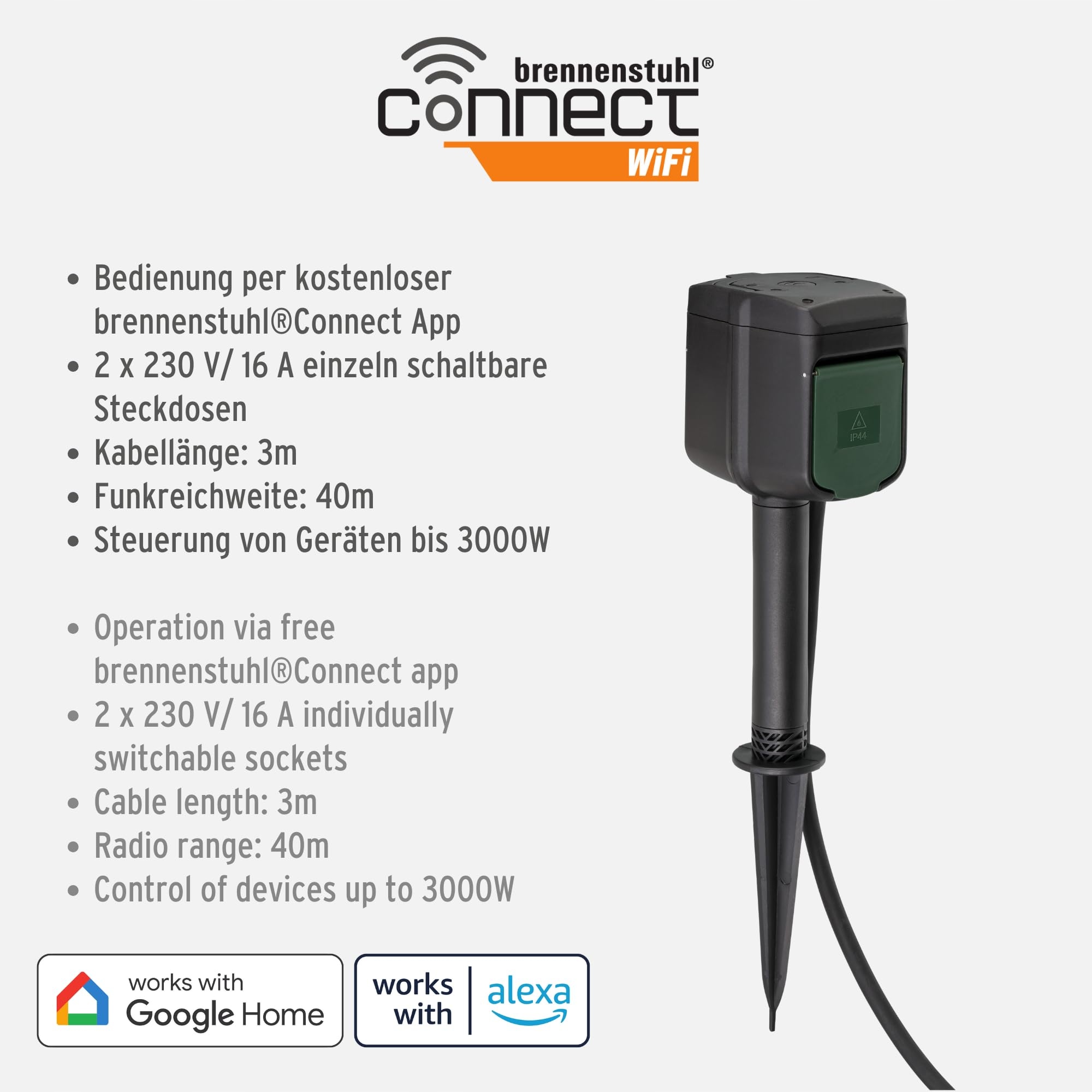 Brennenstuhl Connect WiFi gniazdo ogrodowe/gniazdo zewnętrzne 2-krotne z kolcem ziemnym i płytą montażową (kompatybilne z 2.4 GHz z Alexą i Google Asystentem, timer z programem dziennym i tygodniowym, 3m)