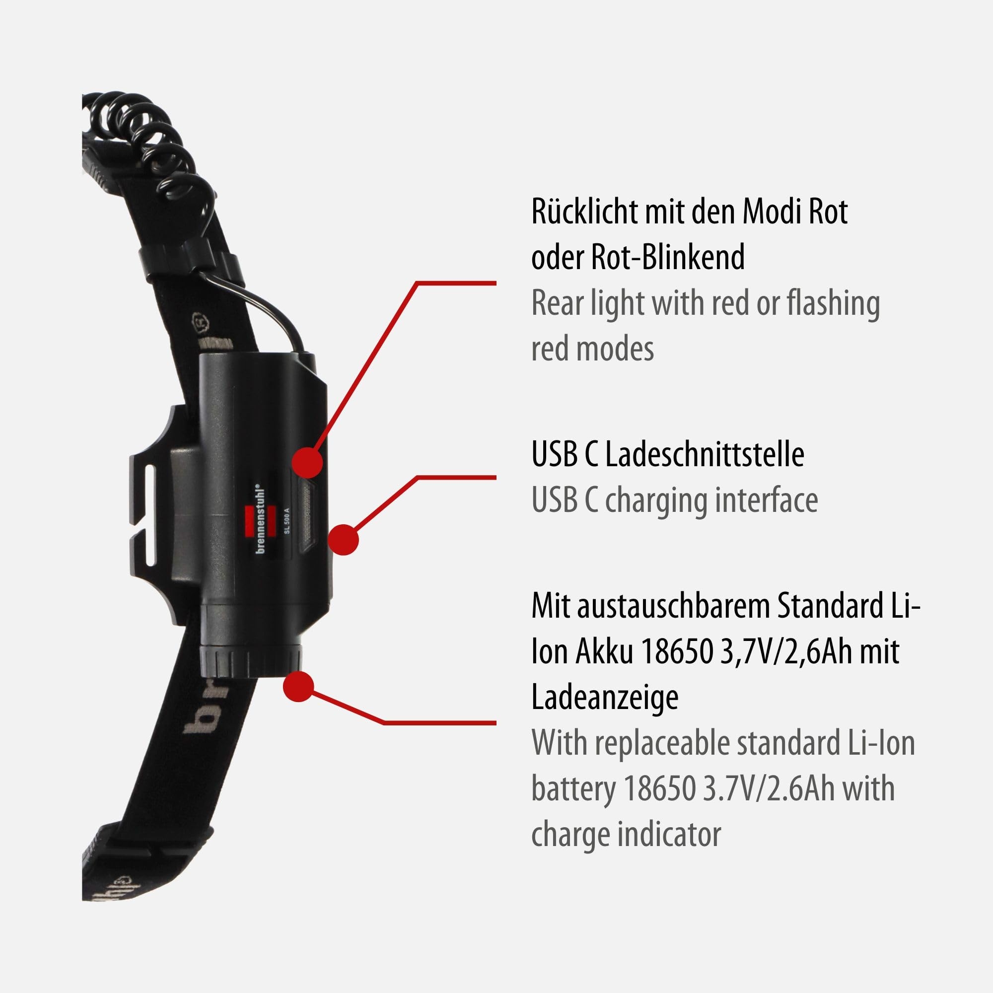 Lampa czołowa Brennenstuhl LuxPremium Akku LED Sensor SL 500 A/Z ładowalną lampą czołową z czujnikiem (lampa czołowa USB C z czerwonym światłem, IP44, COB-LED, 500lm, maks. 22h czasu świecenia, wymienny akumulator 18650)