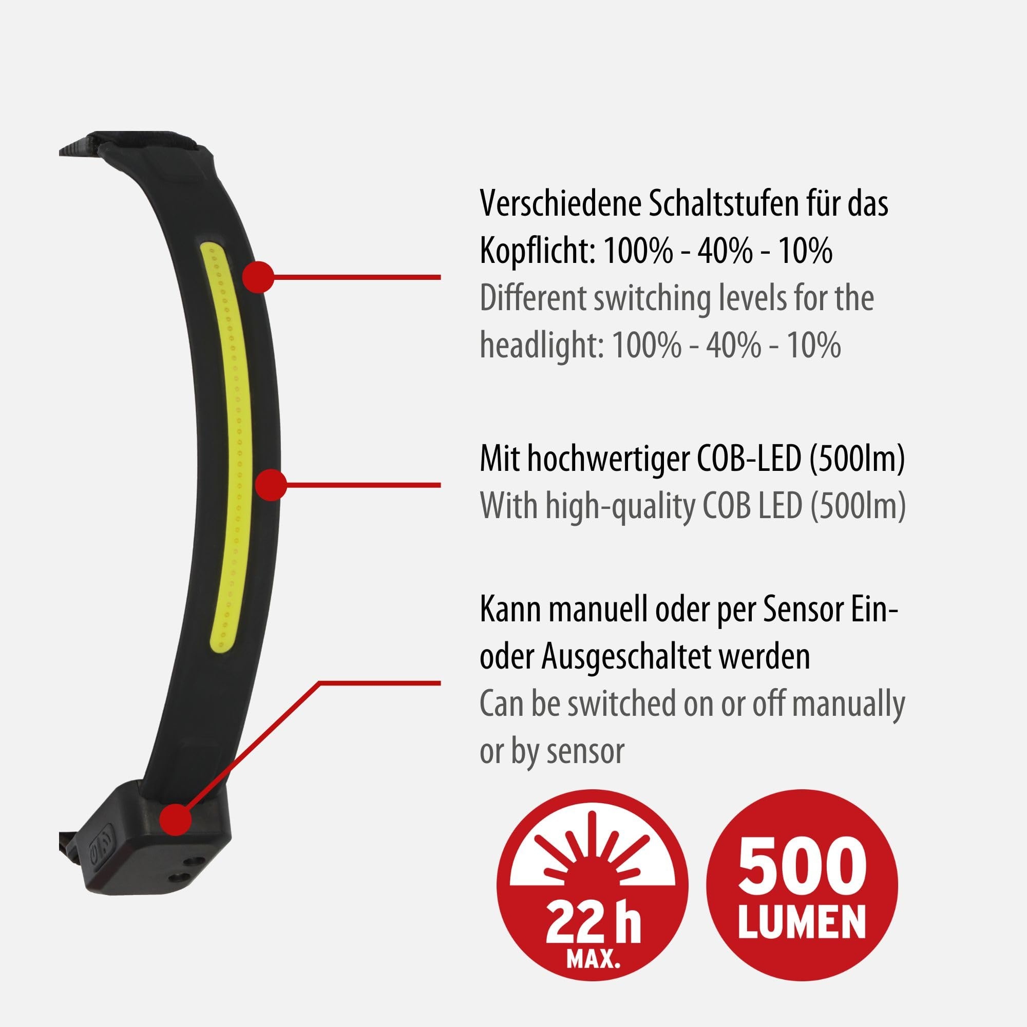 Superjasna lampa czołowa z wysokiej jakości COB-LED (500lm) do szerokiego oświetlenia i dwóch trybów pracy: światło czołowe można włączać lub wyłączać ręcznie lub za pomocą czujnika - bezdotykowa obsługa