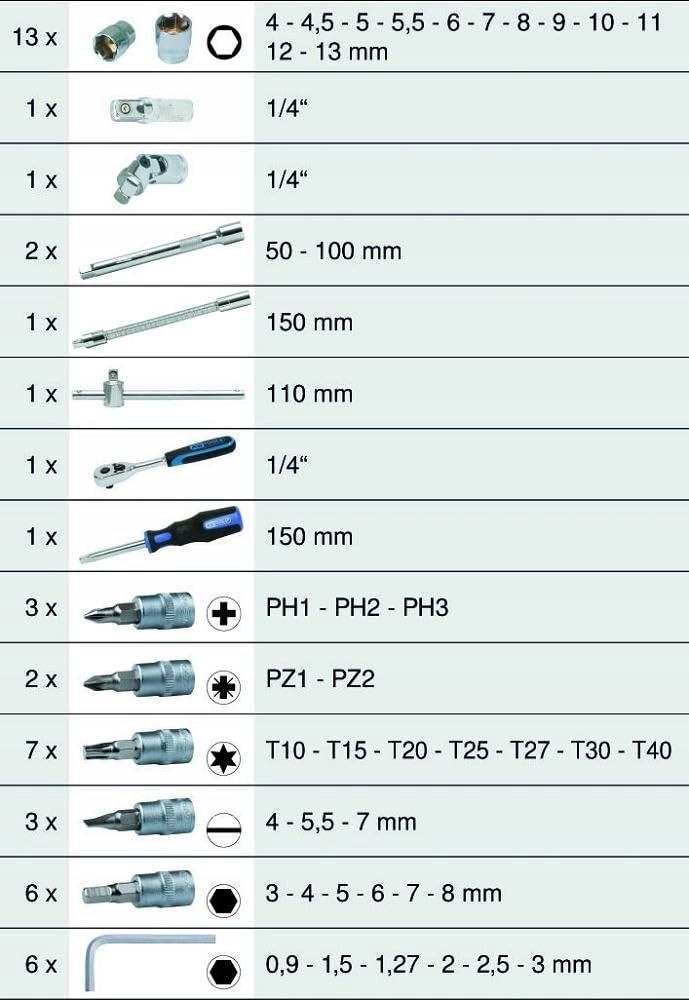Zestaw kluczy nasadowych Chrome zawiera między innymi dużą gamę nasadek 1/4" sześciokątnych oraz nasadek bitowych 1/4" (PH-, PZ-, TX-, płaskie, wewnętrzne sześciokątne) oraz inne akcesoria do kluczy nasadowych