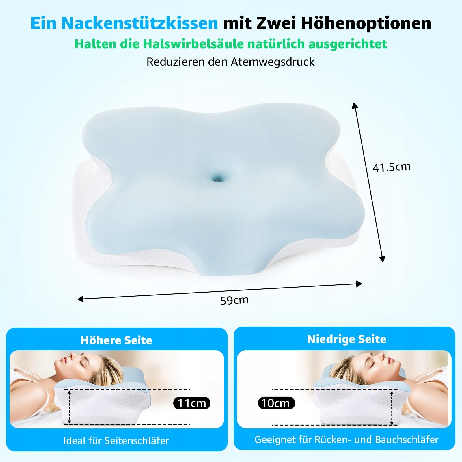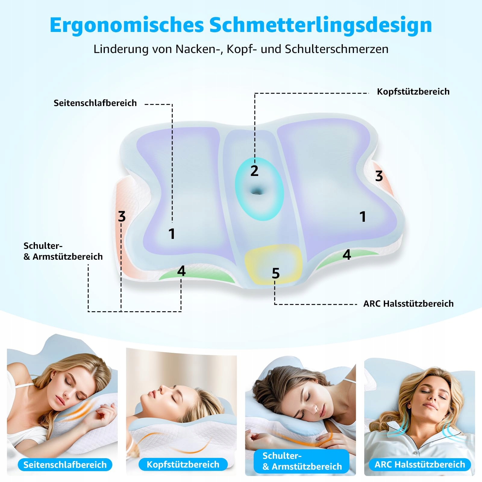Ergonomiczny kształt w formie motyla: Nasza poduszka w kształcie motyla służy do odciążenia szyi i ramion. Ta ergonomiczna poduszka ma 4 strefy funkcjonalne do snu: strefę do spania na boku, strefę podparcia głowy, strefę podparcia ramion i barków oraz strefę podparcia szyi ARC. Pochylona pod kątem 15° pusta powierzchnia sprytnie podtrzymuje twoją głowę, zachowując naturalną krzywiznę szyi i idealnie dopasowując się do kręgosłupa, co zmniejsza sztywność ramion i szyi oraz sprzyja głębszemu, bardziej regenerującemu snu