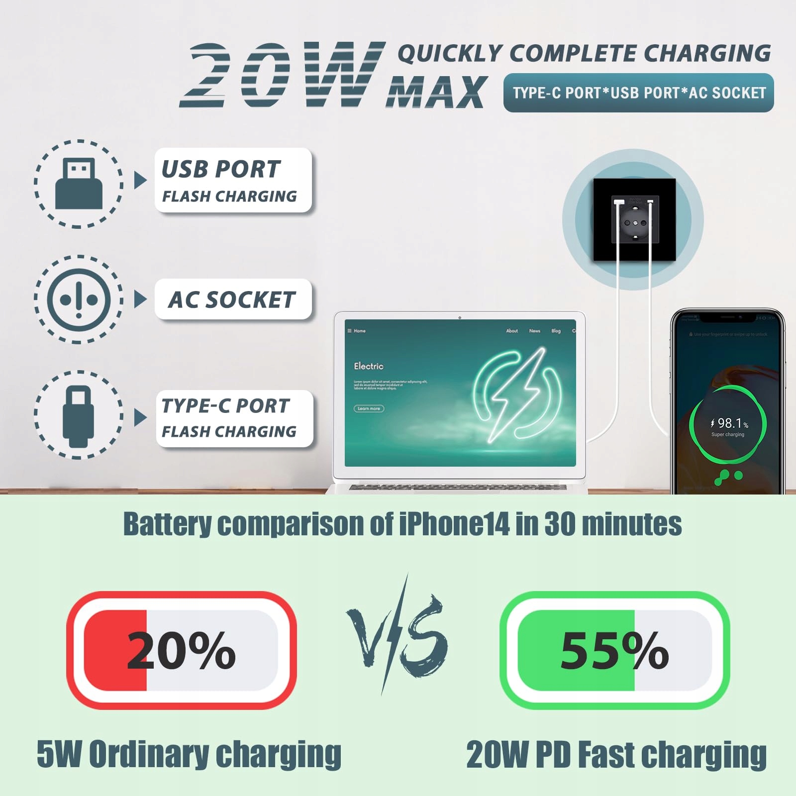 【WYSOKA MOC ŁADOWANIA】: To gniazdo 3 w 1 o mocy 20W z szybkim ładowaniem z portem USB i typem C jest uniwersalnym gniazdem podtynkowym, kompatybilnym z większością urządzeń, takich jak telefon, tablet, smartwatch itp. Porty USB i typ C mogą realizować ładowanie urządzeń elektronicznych bez adaptera. (Uwaga: pełna moc 20W jest dostępna tylko podczas ładowania jednego urządzenia.)