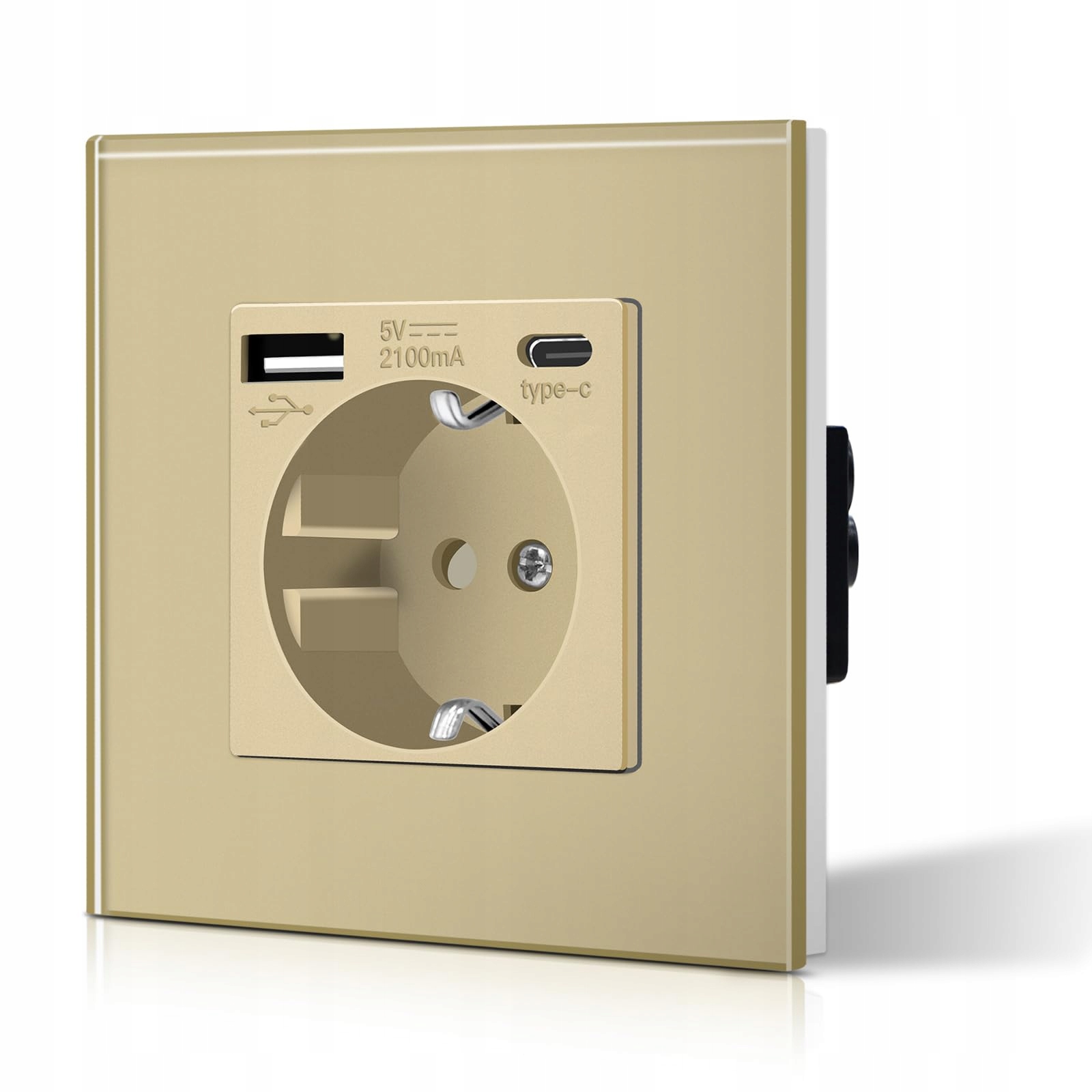 BSEED Gniazdko Schuko USB Typ C Szkło 3w1 Złote Ładowarka 2.1A 3-Przewody