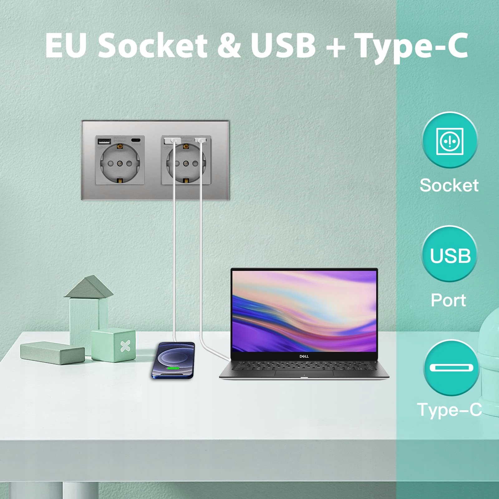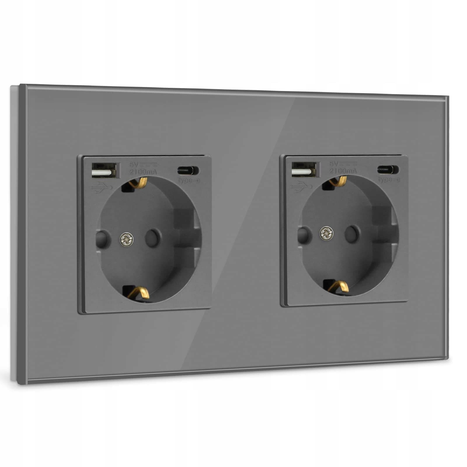 BSEED USB gniazdo podwójne szare gniazdo Schuko z portem USB (maks. 2.1A) port typu C gniazdo podtynkowe szklane gniazdo z uziemieniem ładowarka do telefonów, laptopów itp.