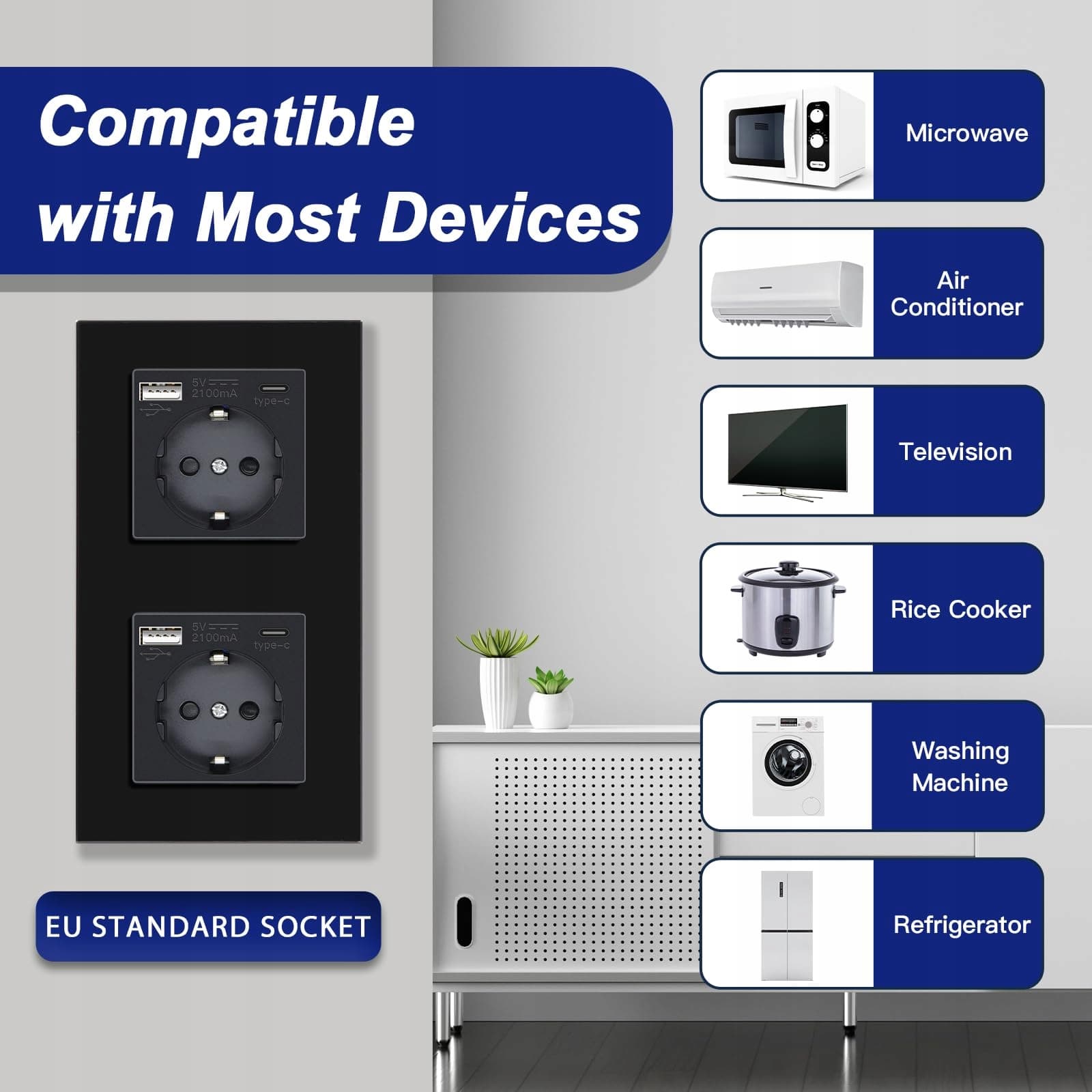 BSEED Podwójne Gniazdo Schuko USB Typ C Szkło 3w1 Czarny 2.1A 157mm