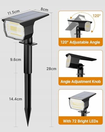 72LED dla jaśniejszego światła: Wyposażone w 72 wysokiej jakości diody LED, 20-50 więcej niż podobne reflektory solarne na rynku. Reflektory solarne btfarm do ogrodu mogą emitować do 1000LM 6500K chłodnego białego światła, co zapewnia jaśniejsze oświetlenie i większy zasięg, dodając Twojemu ogrodowi, domowi, drzewom i krajobrazom witalności i mocy, czyniąc je bardziej spektakularnymi w nocy