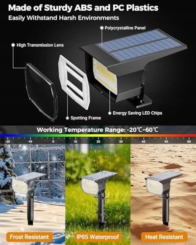 IP65 wodoodporne: Wykonane z wytrzymałego i trwałego tworzywa ABS i PC, lampy solarne do użytku zewnętrznego mogą pracować w warunkach pogodowych od -20℃ do 60℃, skutecznie wydłużając ich żywotność. Obsługują klasę wodoodporności IP65, są odporne na zimno i ciepło, łatwo wytrzymują deszcz, śnieg, wiatr, piasek lub inne trudne warunki pogodowe. Btfarm oferuje 90-dniową gwarancję zwrotu pieniędzy i 1 rok zwrotu (wymiany) w przypadku problemów z jakością