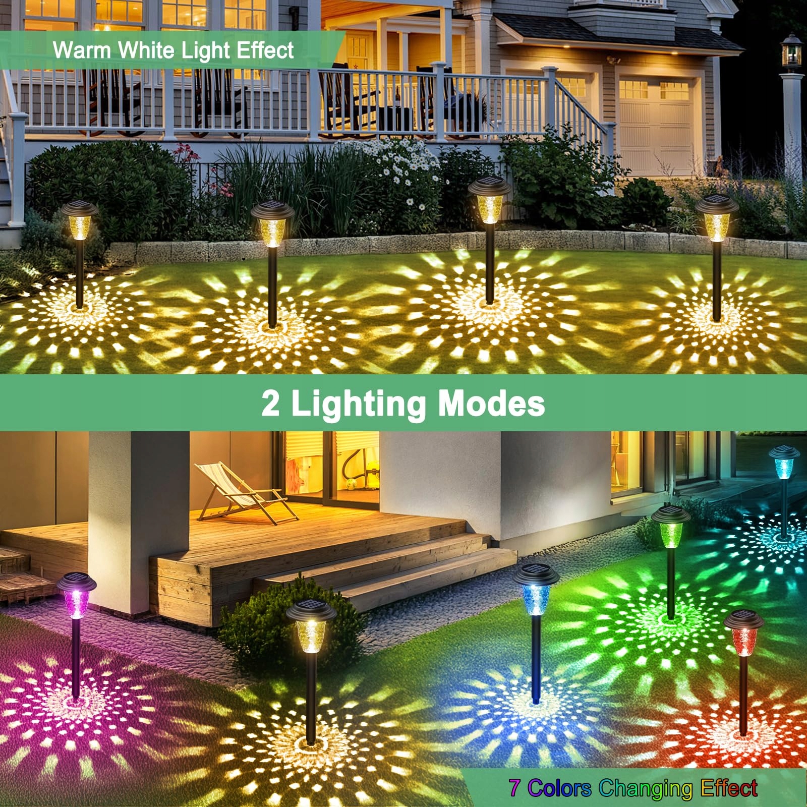 Lampy solarne z 2 trybami: Ulepszone lampy solarne BUCASA do ogrodu na zewnątrz posiadają 2 tryby oświetlenia: tryb ciepłej bieli do codziennego oświetlenia oraz tryb zmiany kolorów na święta, imprezy i dekoracje ogrodowe na zewnątrz. Lampy solarne do ogrodu rzucają przez przezroczysty klosz atrakcyjny wzór na ziemię, tworząc przyjemną atmosferę, która naprawdę zdobi ogród