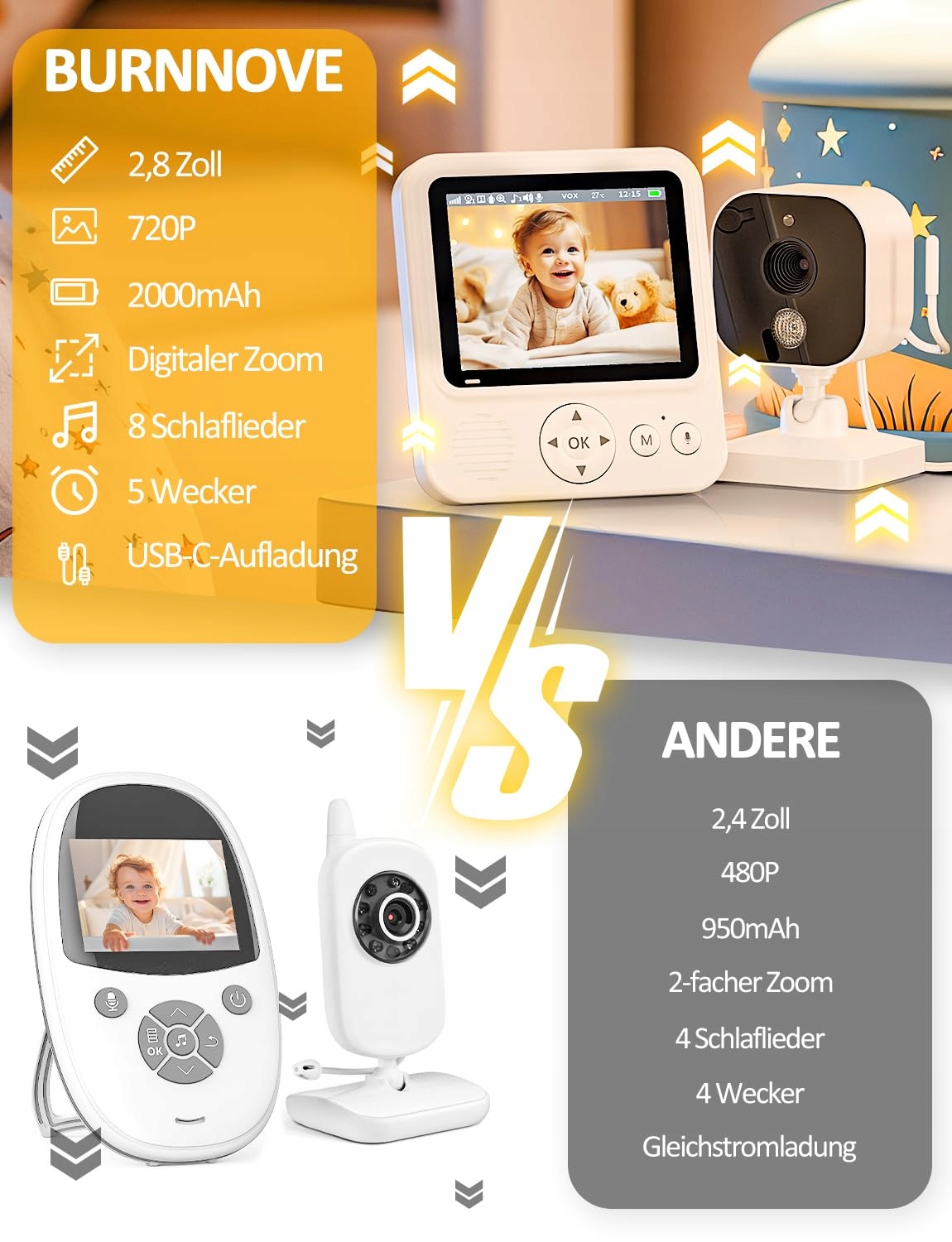 BURNNOVE Babyfon z kamerą 720P IPS Video Babyfon bez Wi-Fi 2000mAh Akumulator Tryb VOX Nocna wizja Alarm temperaturowy Funkcja interkomu Zoom cyfrowy 8 kołysanek i 5 budzików