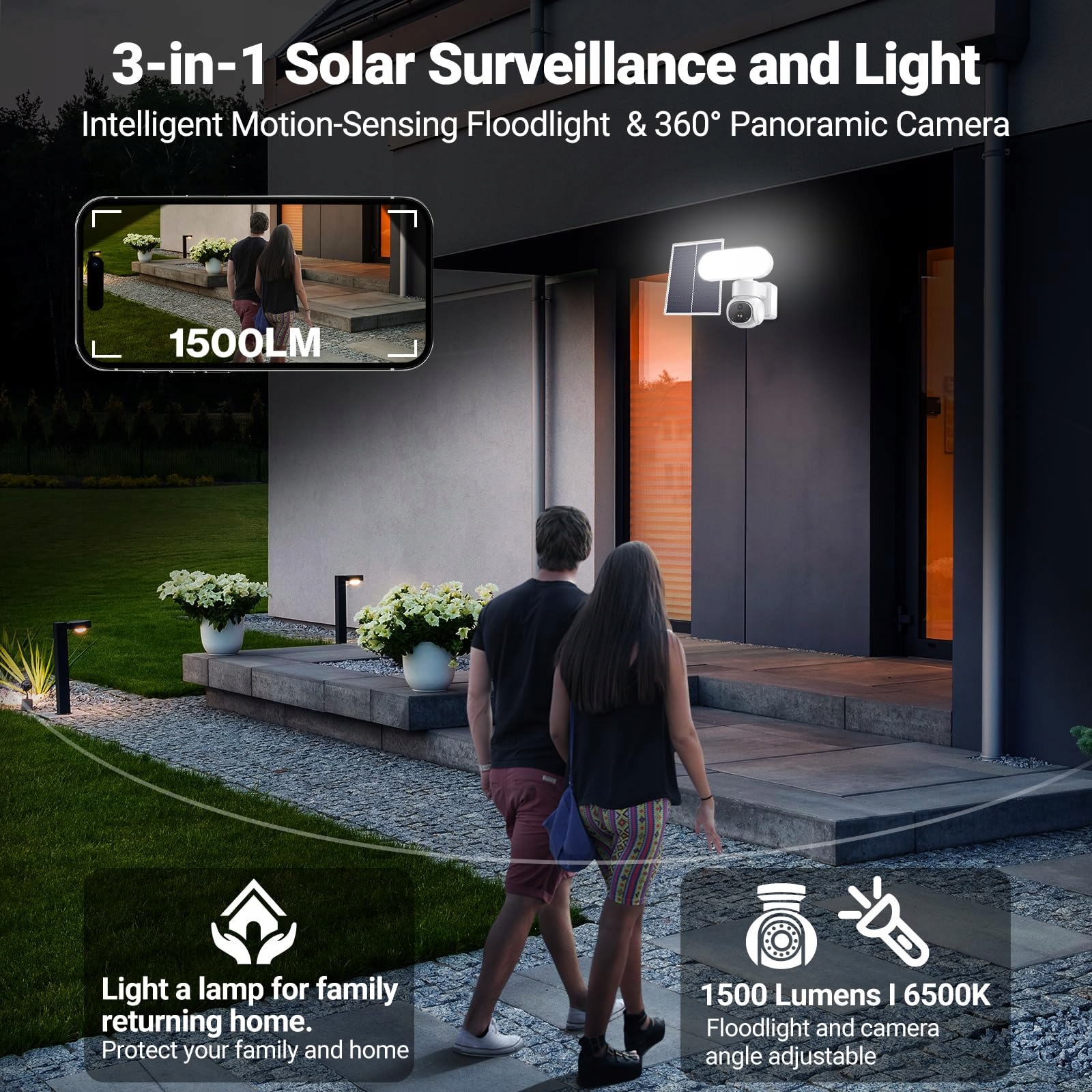 【Monitorowanie 2K HD + 360° nadzór】Kamera monitorująca na zewnątrz solar ma rozdzielczość 2K i jest wyposażona w bardzo jasne światło zalewowe o mocy 1500 lumenów. Dzięki wbudowanej technologii AI można precyzyjnie rozpoznawać ludzi, pojazdy i zwierzęta domowe. Z nadzorem 360° bez martwych punktów i pokryciem reflektora 180° wspiera funkcje obrotu i pochylania, aby zapewnić kompleksowy nadzór ze wszystkich kątów.