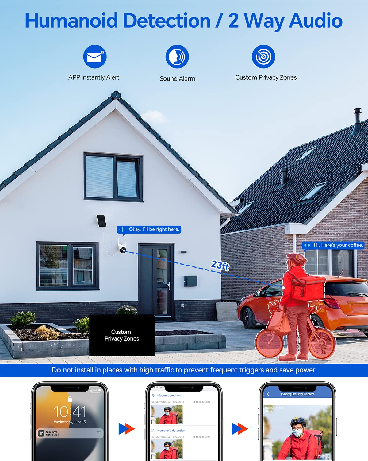 Detekcja ruchu PIR, natychmiastowe powiadomienia w aplikacji, dwukierunkowe audio: Kamera solarna Camcamp obsługuje detekcję ruchu PIR oraz wykrywanie humanoidów. Gdy ktoś przechodzi obok, otrzymujesz natychmiastowe powiadomienie w aplikacji. Kamera zewnętrzna do monitoringu posiada wbudowane mikrofony i głośniki, które wspierają dwukierunkowe audio.
