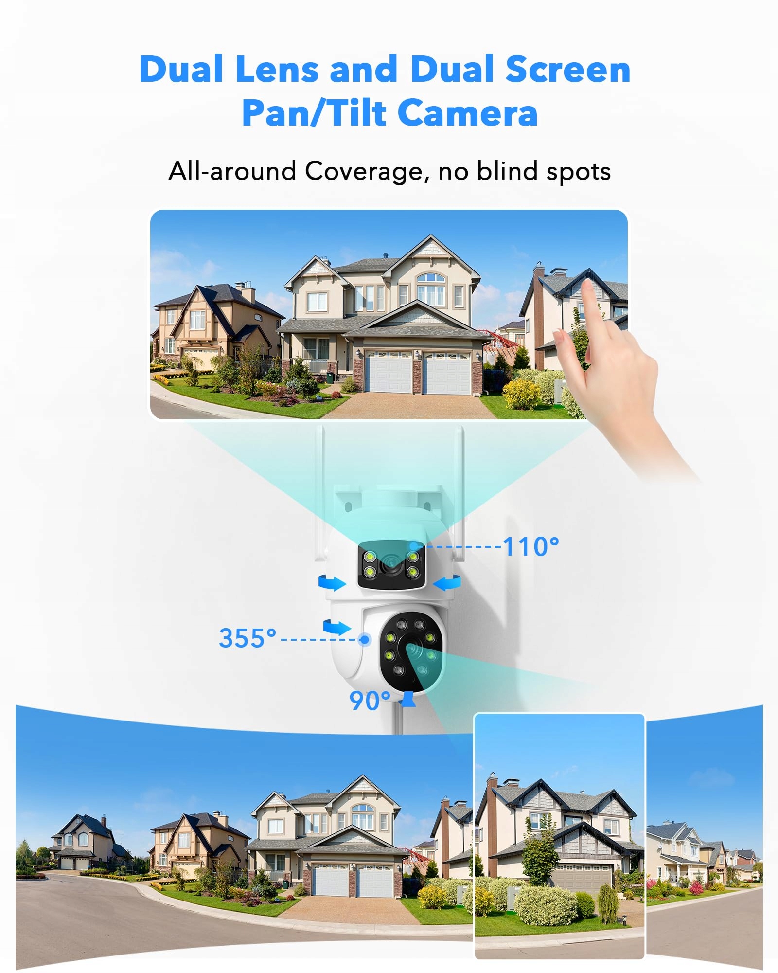 PODWÓJNY OBIEKTYW I PODWÓJNY EKRAN 360° PTZ KAMERA PANORAMICZNA: Bezprzewodowa kamera PTZ ma dwa obiektywy: jeden 110° kamera typu bullet (kąt regulowany ręcznie) do monitorowania kluczowego obszaru, drugi to kopułkowa kamera obracana o 355° i pochylana o 90° (obracana na telefonie), która obejmuje wszystko wokół bez martwych stref. Ten zestaw kamer WLAN oferuje wielokątne monitorowanie i podwójne widoki na każdym ekranie kamery, podwajając ochronę Twojego domu
