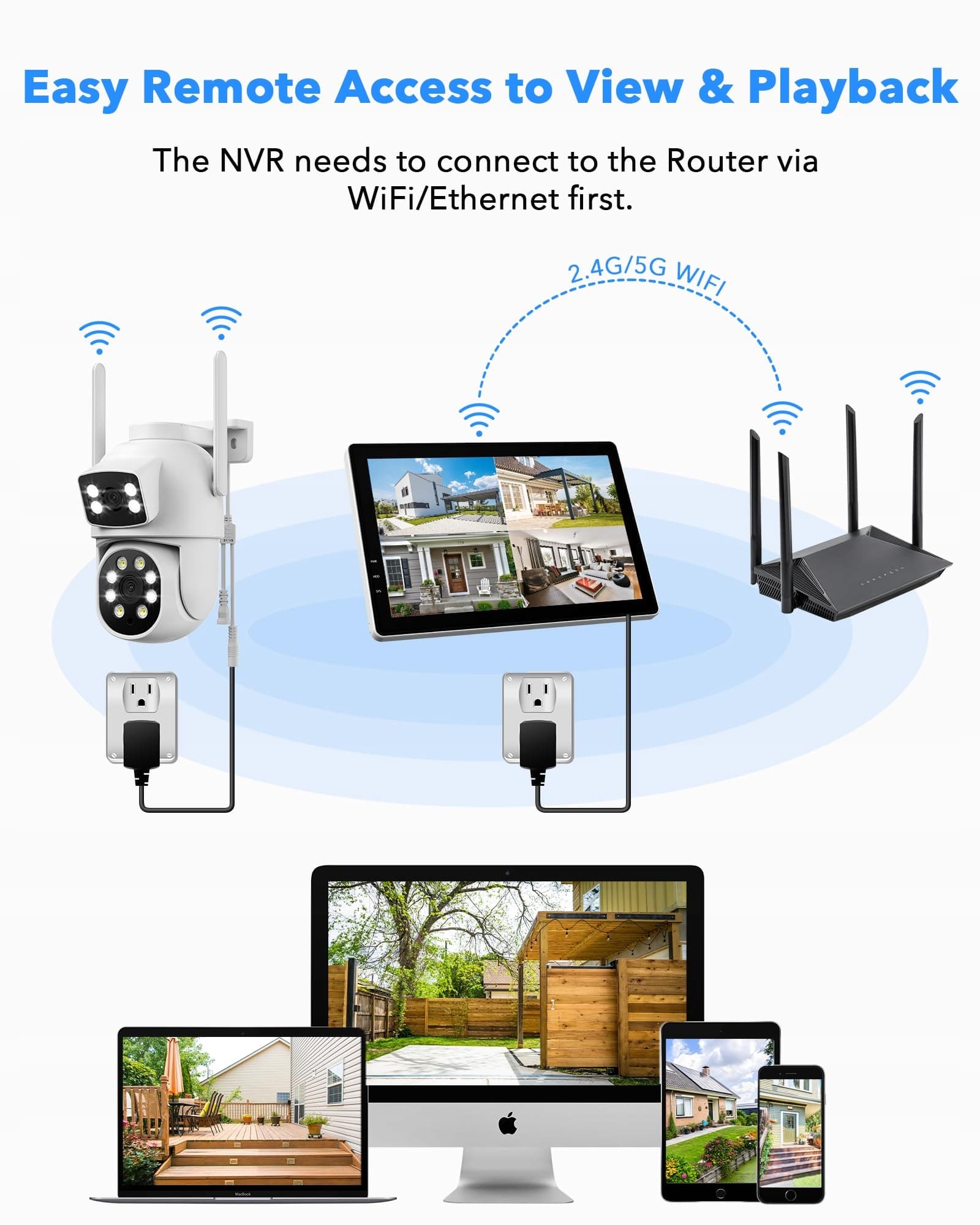 ROZBUDOWALNY NVR 10-KANAŁOWY I WYŚWIETLACZ WYJŚCIA HDMI: Bezprzewodowa kamera z podwójnym obiektywem WiFi na zewnątrz z monitorem posiada 10-kanałowy 2K podwójny WiFi LCD NVR monitor, który pozwala dodać do 10 przewodowych/bezprzewodowych kamer Camcamp CCTV, aby rozszerzyć potrzeby monitoringu. Dzięki złączu HDMI na monitorze możesz łatwo podłączyć NVR do większego ekranu monitora/Smart TV/komputera, aby wyświetlać więcej szczegółów