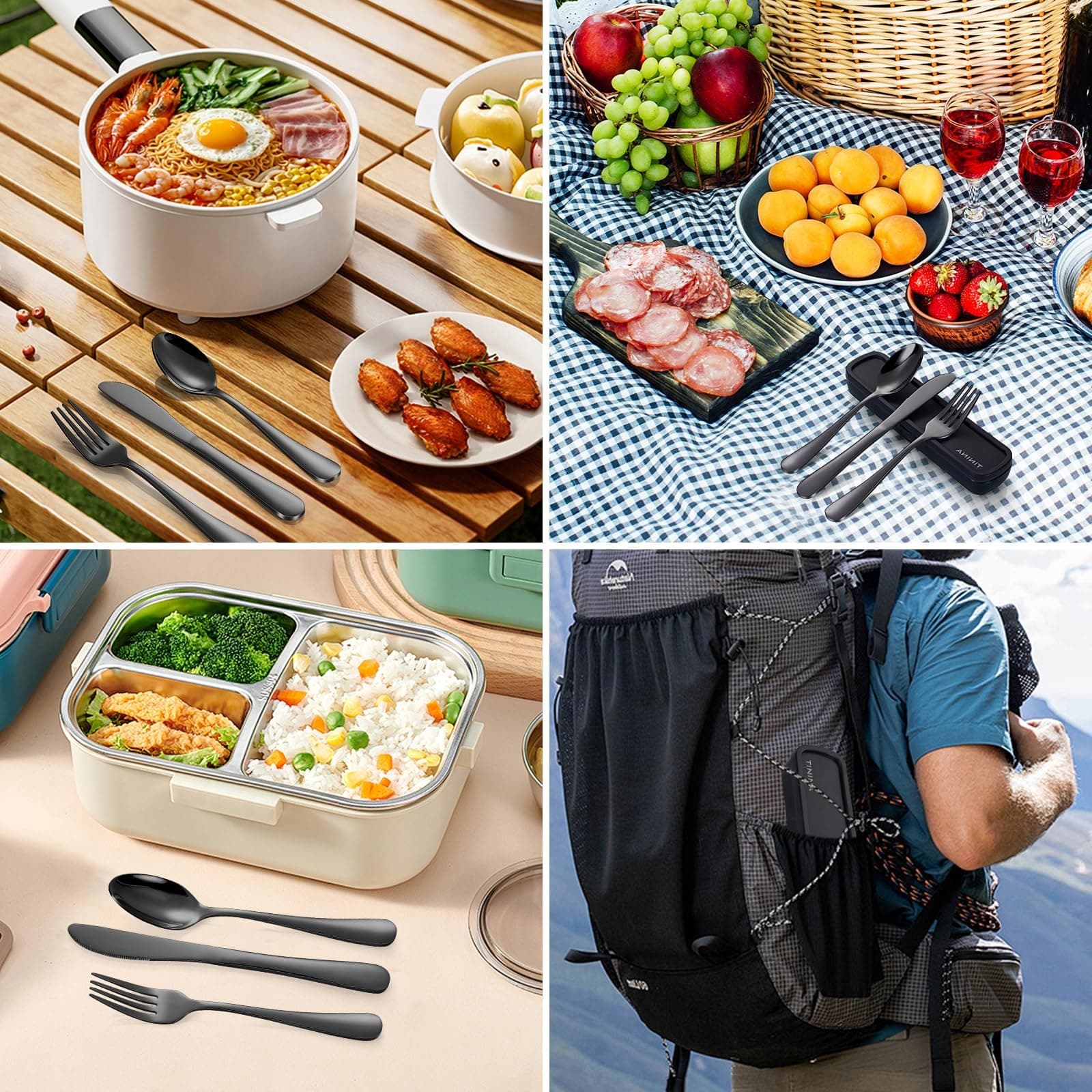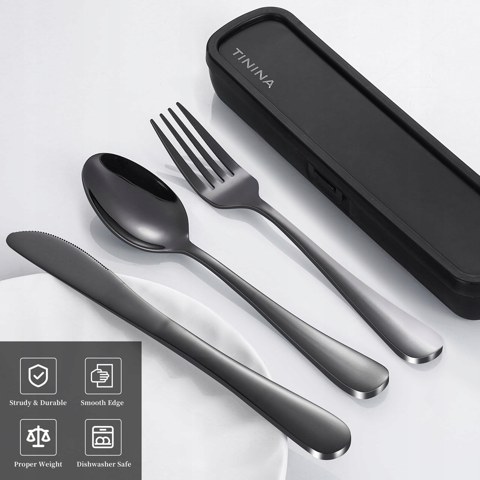 4-częściowy zestaw sztućców podróżnych z etui: Zawiera 1 x nóż stołowy, 1 x widelec stołowy, 1 x łyżkę oraz 1 x etui na sztućce podróżne. Kompaktowy i lekki, ten zestaw sztućców jest łatwy do przenoszenia. Nadaje się na różne okazje, w tym do codziennego użytku, podróży, pikników, kempingu, nauki w szkole lub pracy w biurze.