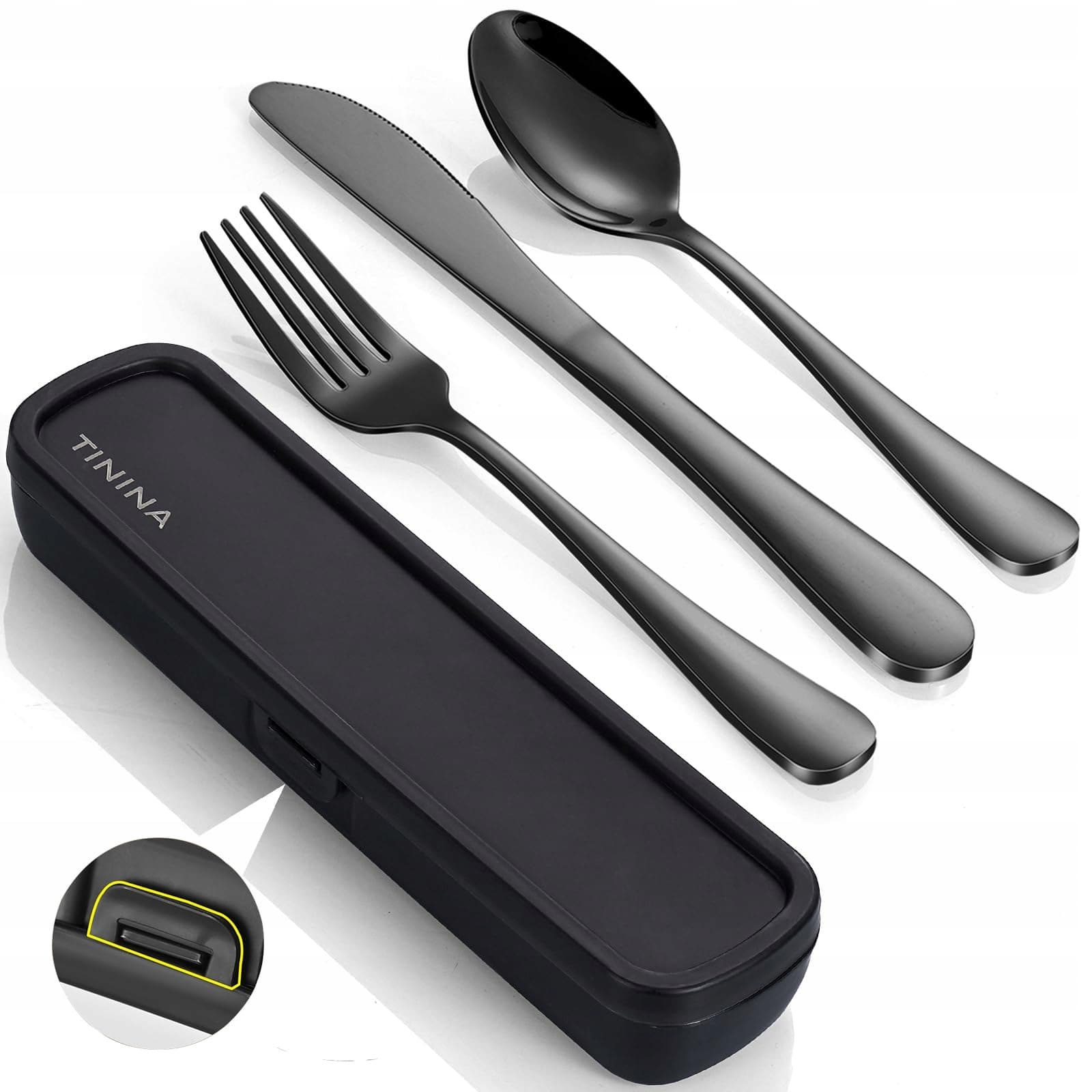 Zestaw sztućców kempingowych, 4-częściowy zestaw sztućców ze stali nierdzewnej z etui, wzmocnione etui z zapięciem, sztućce kempingowe na zewnątrz, podróż, praca, szkoła, nadające się do mycia w zmywarce, czarne