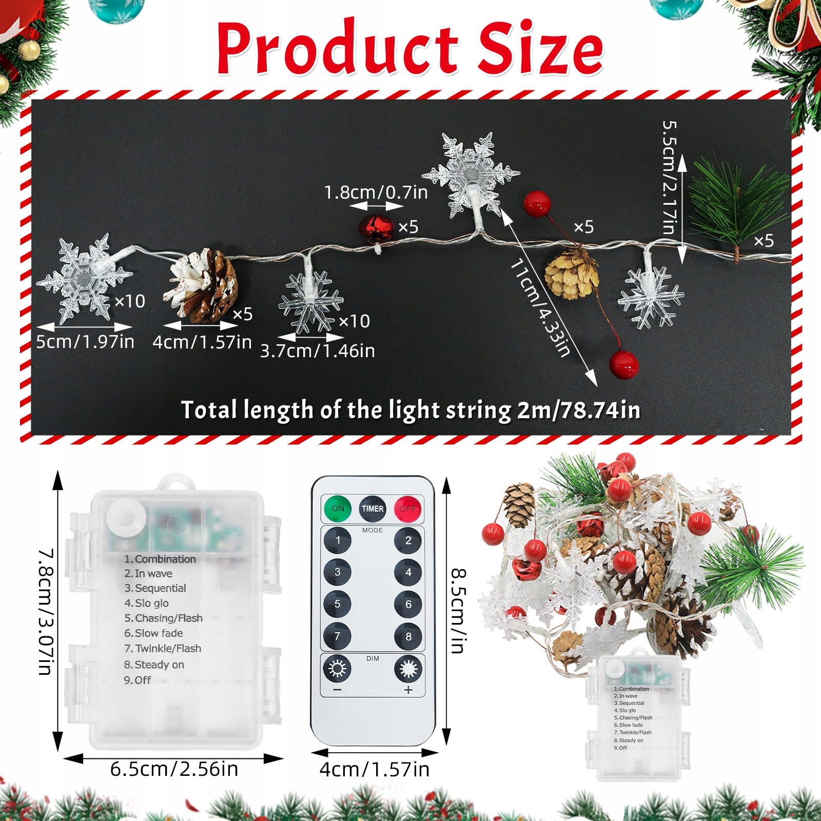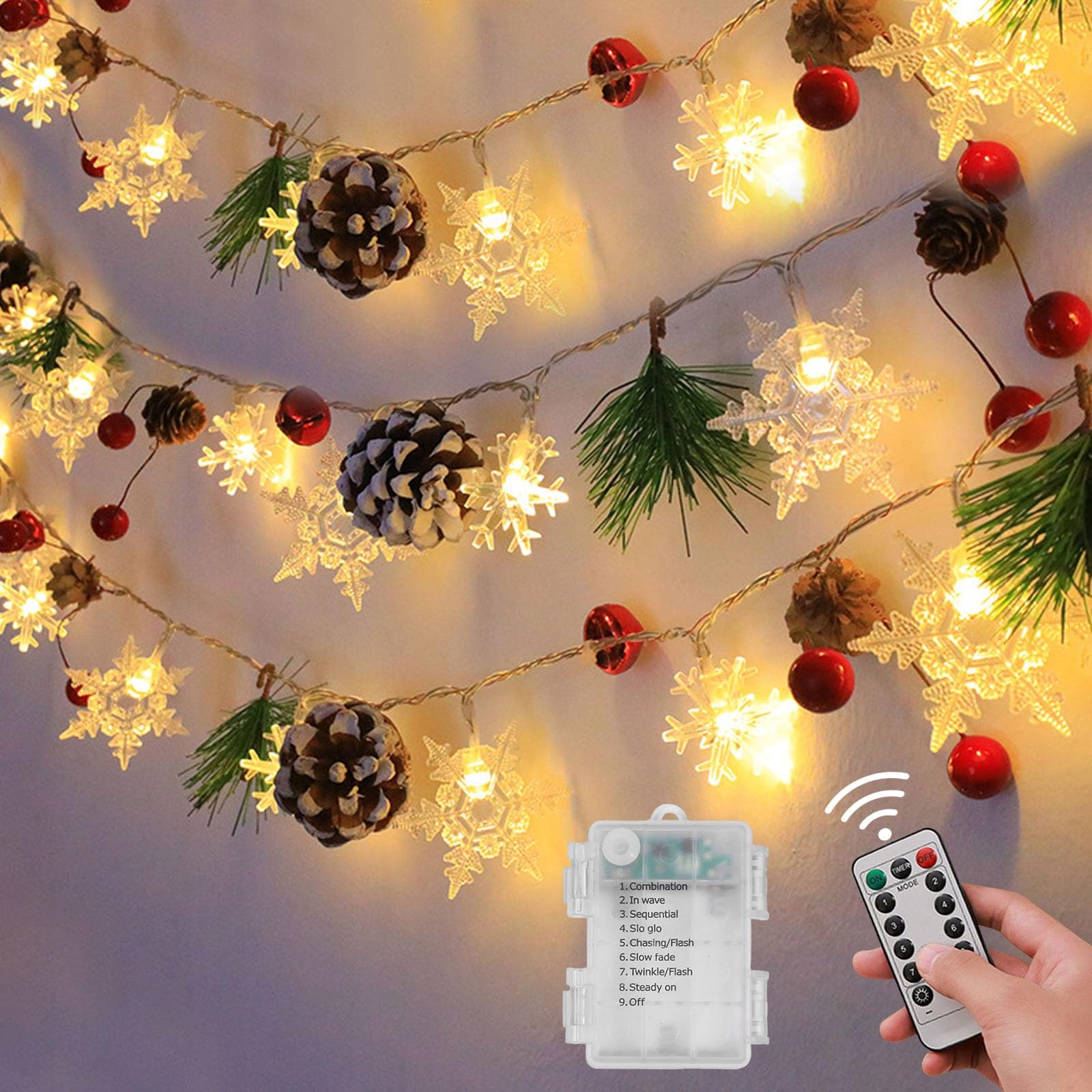 Świąteczna dekoracja świetlna: Te światełka świąteczne zawierają różne motywy świąteczne: 20 śnieżynek, 10 szyszek, 5 gałązek jodły, 10 jagód ostrokrzewu i 5 czerwonych dzwoneczków. Łatwo je wkomponować w Twoją świąteczną dekorację