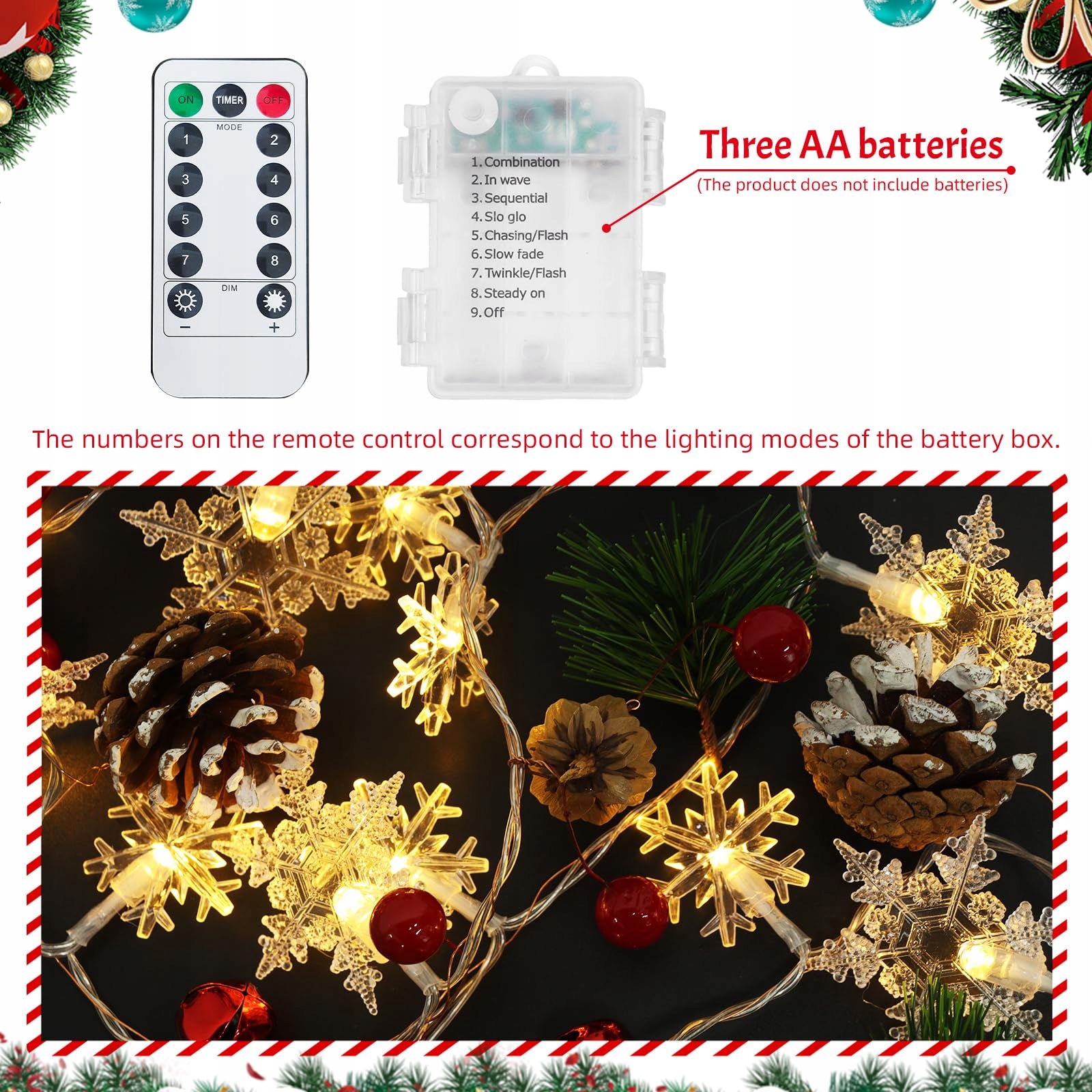 Zasilanie na baterie: Świetlna girlanda świąteczna jest zasilana przez 3 baterie AA (baterie nie są dołączone), bez ograniczeń związanych z gniazdkiem elektrycznym. Małe pudełko na baterie można łatwo ukryć i umieścić w dowolnym miejscu