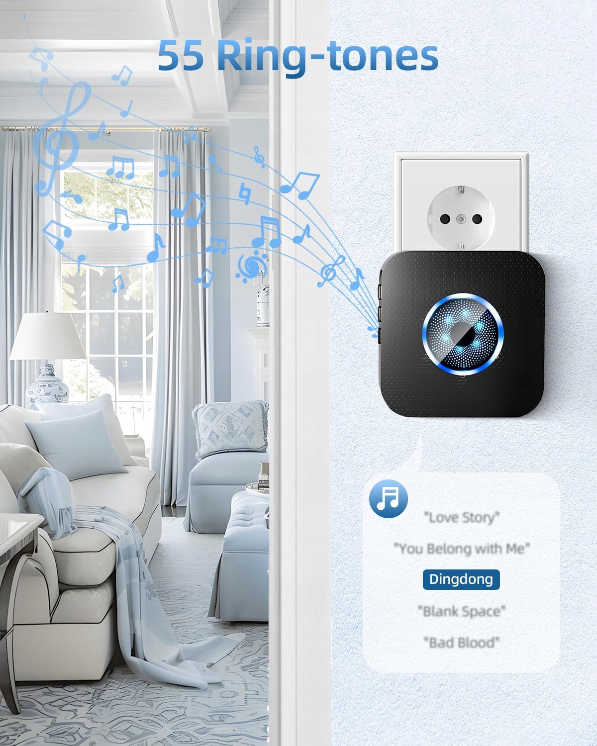 Dzwonek bezprzewodowy, zestaw dzwonków do drzwi, zasięg 300m, IP55, wodoodporny, dzwonek do drzwi z 1 odbiornikiem Plug-In, 55 melodii, 5 poziomów głośności, światło RGB