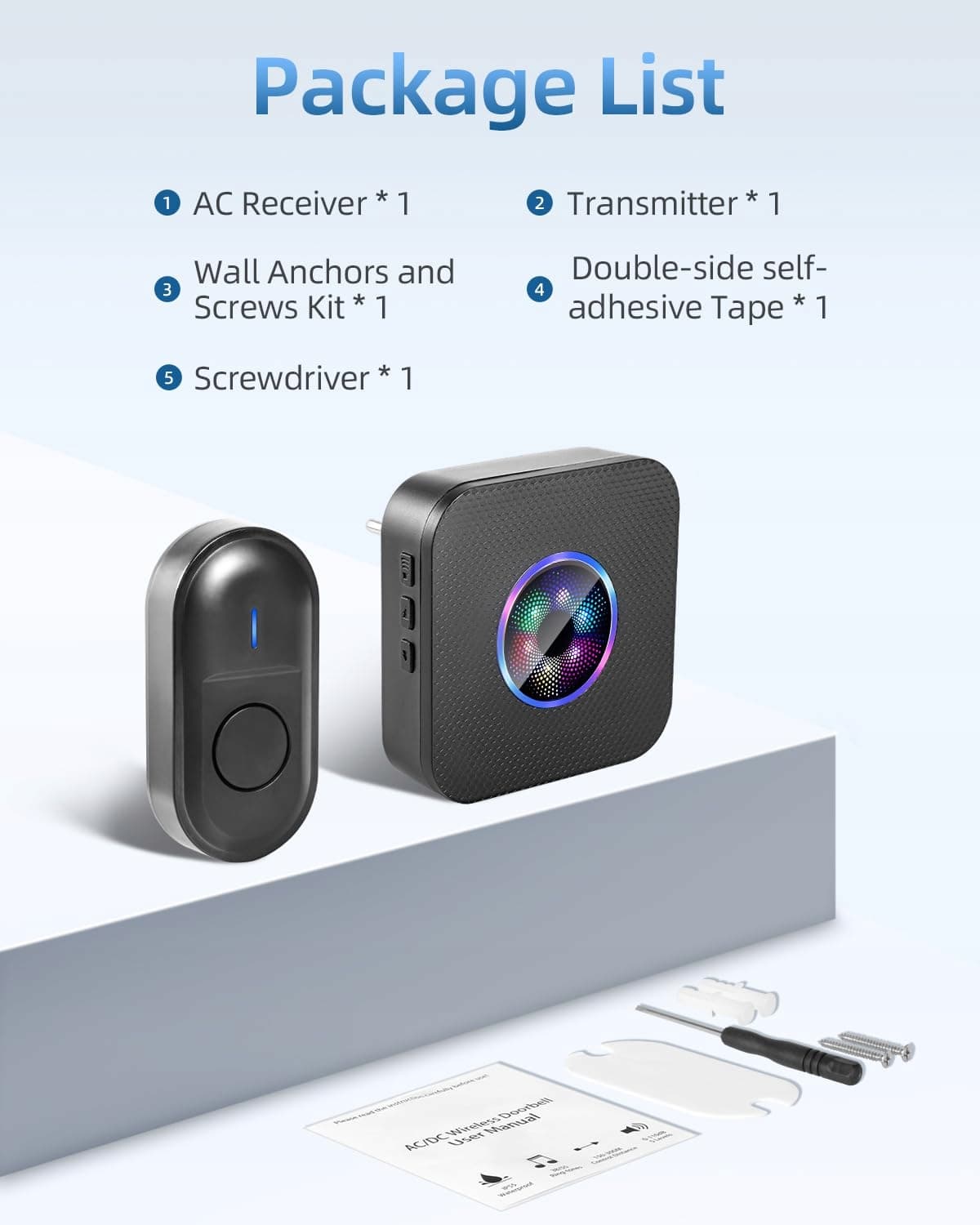 - **Łatwa instalacja**: Zainstaluj swój dzwonek bezprzewodowy bez wysiłku za pomocą dołączonej taśmy dwustronnej lub śrub, co zapewnia elastyczność i komfort dla każdego wnętrza.