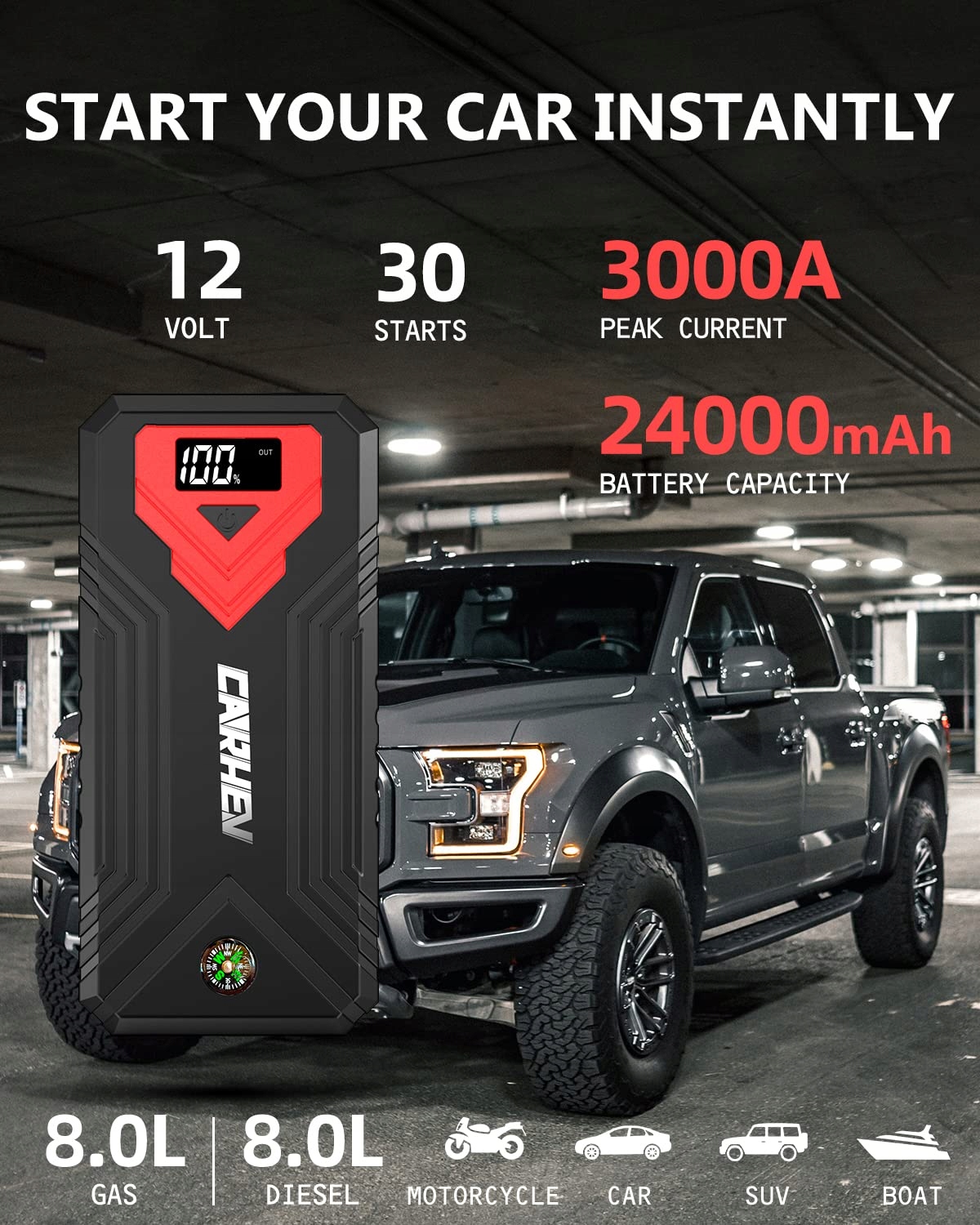 MOCNE WYKONANIE - Z 3000A szczytowego prądu. CARHEV 3000A Starthilfegeräte może uruchomić samochód z silnikiem benzynowym do 8L i silnikiem diesla do 8L w kilka sekund, odpowiedni dla samochodów 12V, ciężarówek, motocykli, łodzi, jachtów, kosiarek, ATV, SUV-ów, skuterów śnieżnych, pickupów i innych. Może pracować w temperaturze od -20°C do 60°C, urządzenie może być również używane w ekstremalnych warunkach pogodowych.