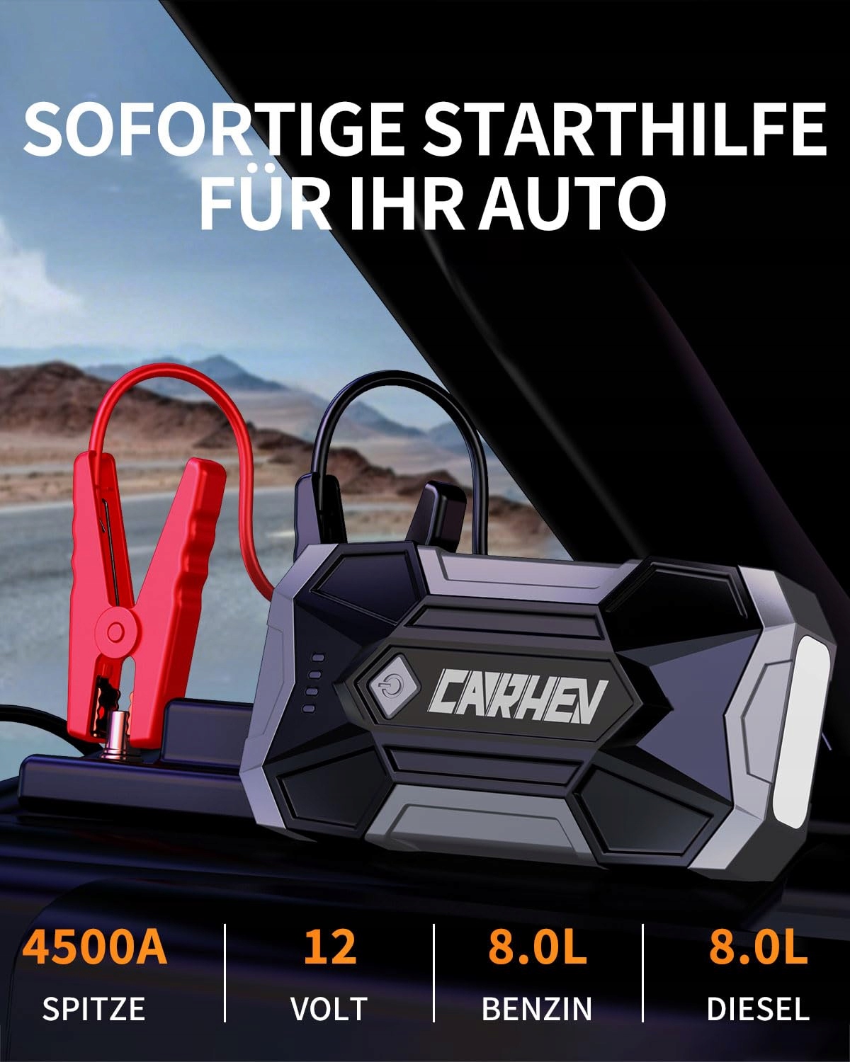 CARHEV Powerbank rozruchowa do samochodów osobowych, rozruchowa powerbank 4500A (do 8,0L benzyny lub 8,0L diesla), booster rozruchowy z LED, jump starter z kablami rozruchowymi i 2 wyjściami USB