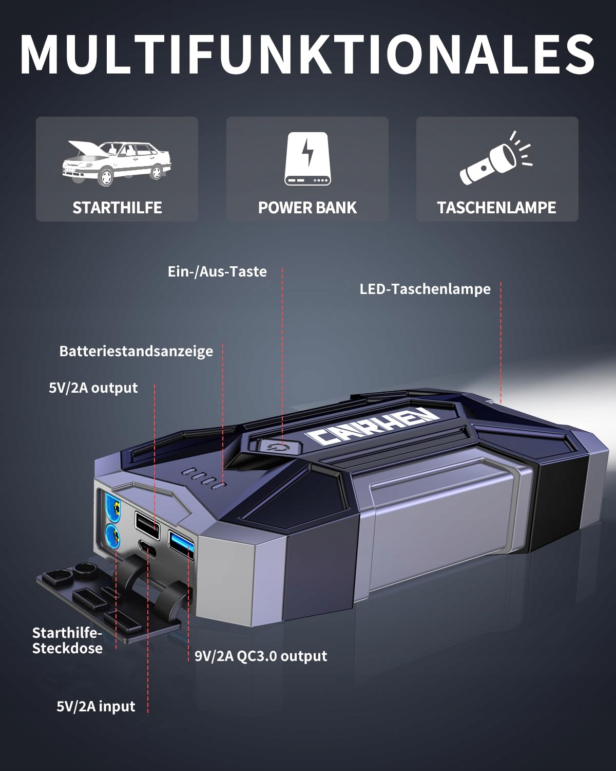 【WIELOFUNKCYJNA ROZRUSZKA】CARHEV to nie tylko rozrusznik samochodowy, ale także przenośna powerbank i LED-owe światło awaryjne. Posiada dwa wyjścia USB (9V/2A) i (5V/2A), w tym jedno złącze USB QC3.0 do szybkiego ładowania smartfonów, tabletów i innych urządzeń mobilnych. Wbudowana lampa LED oferuje trzy tryby: latarkę, światło błyskowe i światło SOS. Idealny towarzysz na kemping, na zewnątrz, w sytuacjach awaryjnych i podczas podróży